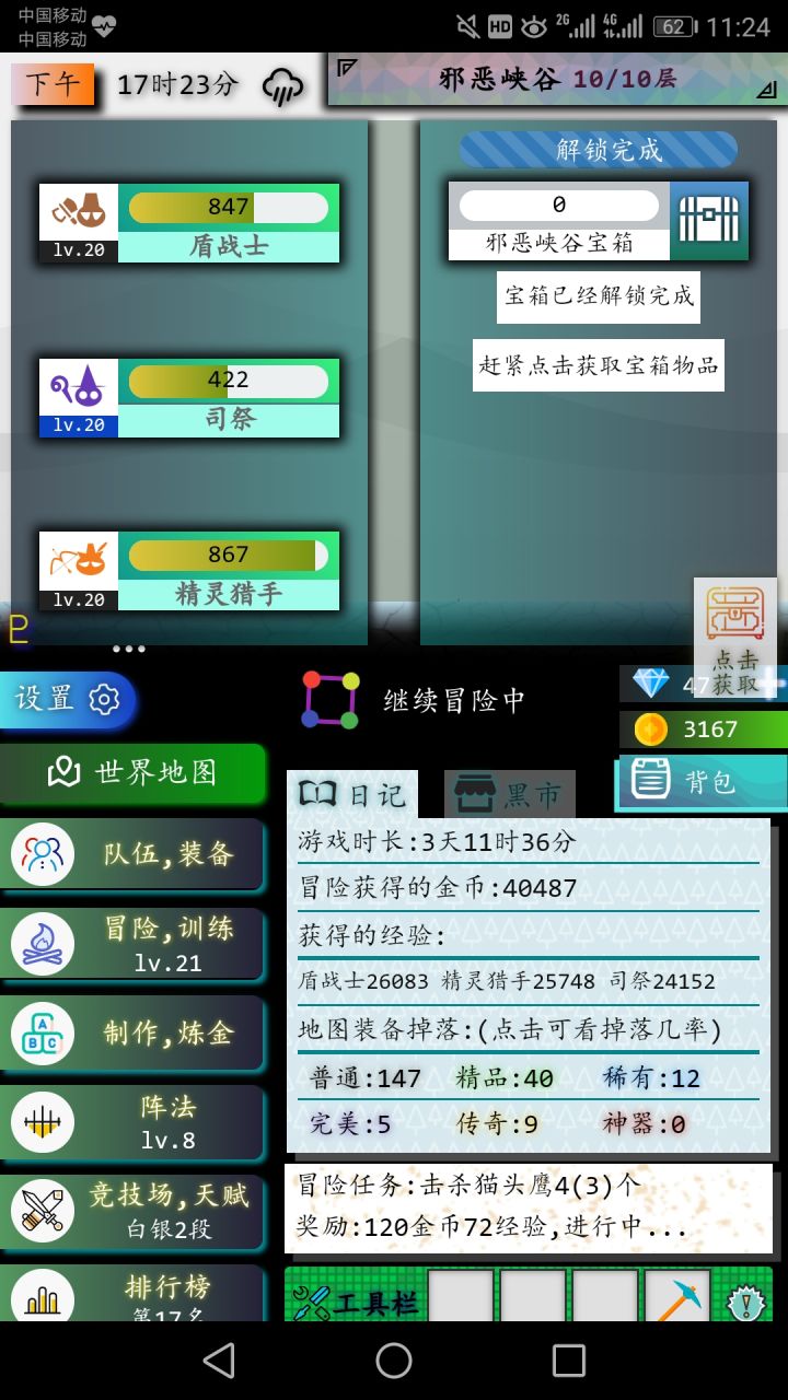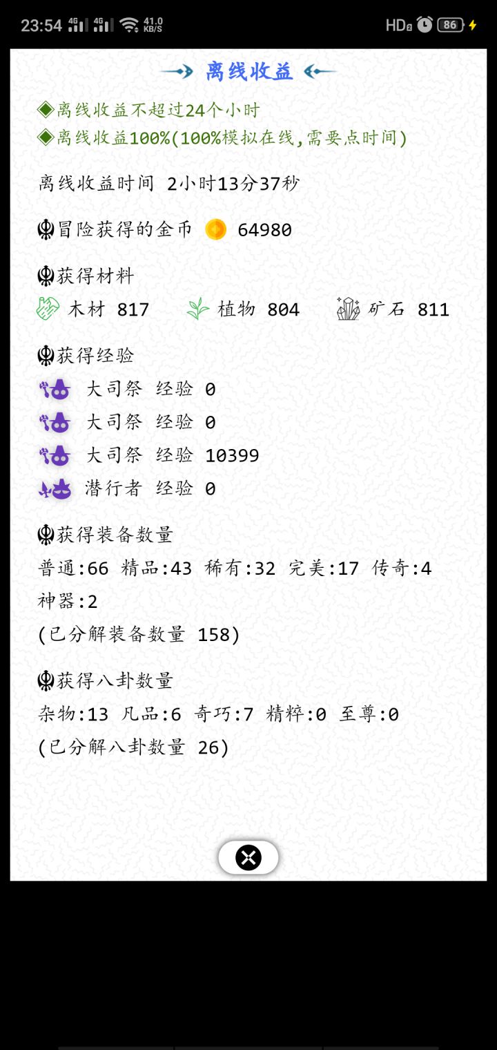 这个游戏很良心很不错,小而精。希望作者后面尽快更新地图和修复bug。下面是我玩了一晚上的成果和心得,希望对大家有所帮助。🎈如果卡了,就重新进去游戏,有按不动的选项,也可以重新进去游戏试试。🎈平时最好挂机,或者用电脑模拟器挂机,因为离线收益是下次更新内容,不挂机的话装备太少了。🎈刚开始的时候就先升级 升技能 有装备就穿 然后探索一轮后 就可以打boos了 感觉能打过就去打 通过关卡越多,解锁