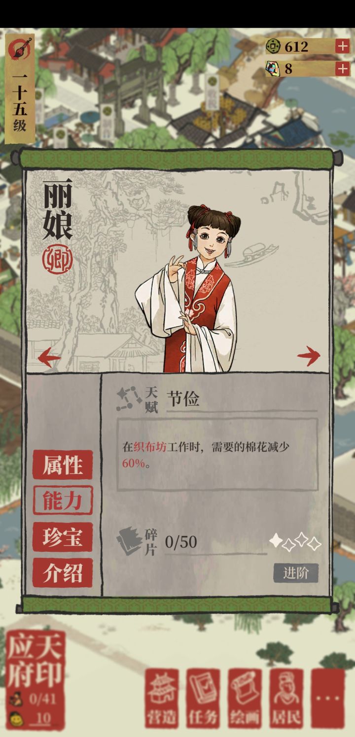 城外郊区左边是我的农业基地,加成buff我选的是棉花和渔场。菜地的话如果需要替代可以加两个。右边是我的素贞造纸行,开局给的白素贞可以说是我的当家老板娘,手底下吴黎,董其昌,杜甫这几个小跟班。从种树到伐木造纸一条龙服务。黄城区作为衙门口前面的区域那必须是整个镇子最繁华的片区这里住着我仅有的四张黄卡,本非酋得到这几张黄卡实属不易。别人怎么对黄卡我不管,既然来了那我就不能亏待了他们,最好的地段