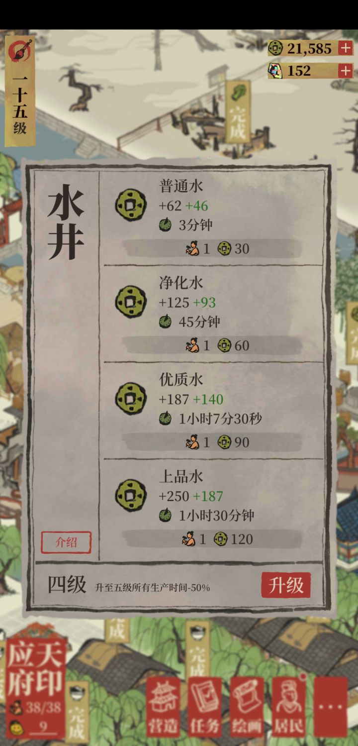 先来一张横版俯瞰图,是不是还不错!再放一些细节总体来说画风很喜欢,感觉自己可以肝出一幅《江南百景图》的!这个游戏小坑还是挺多的,经验太细节了,可以评论区交流。给大家分享一些最要紧经验吧,3点!1.一定要围绕神像发展经济,初期围绕财神爷建水井!中后期围绕其它的神像发展给个区域的经济,经济是王道,后面探索新区域贼贵。2.探索新区域一定要先看看“神像”,类似财神爷,你只能把水井和餐馆放它旁边