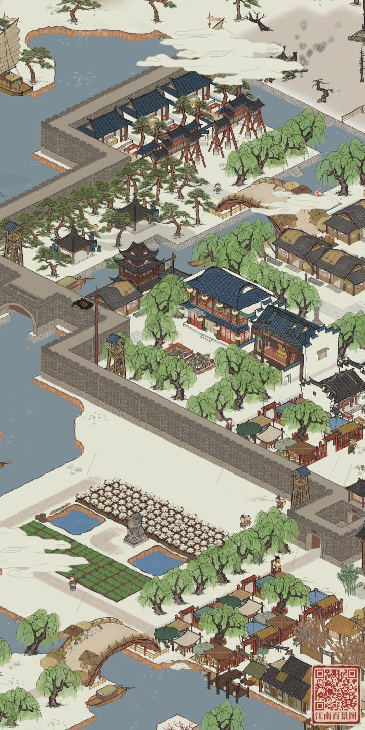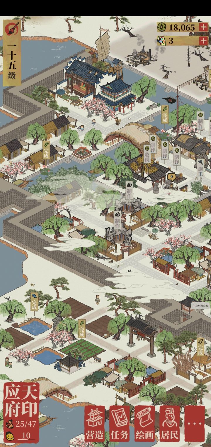 游戏画风很精美,有一种江南水乡的感觉啊。让我觉得大宋应该就是这个样子,圆了一个穿越梦,虽然好像背景是明初。今天就要拜拜了,有点舍不得,为什么要删档呢?好不容易安排的这么好看,唉!游戏体验还可以,就是一些建造或者制作的时间太长了,三个小时俩小时的,希望可以短一点。是个悠闲地种田游戏啊⊙_⊙,我好像太心急了。还有一个就是金画轴有很多,代表可以抽出来很多人物,但是州府的能力限制了住宅的数量和住的人数,只