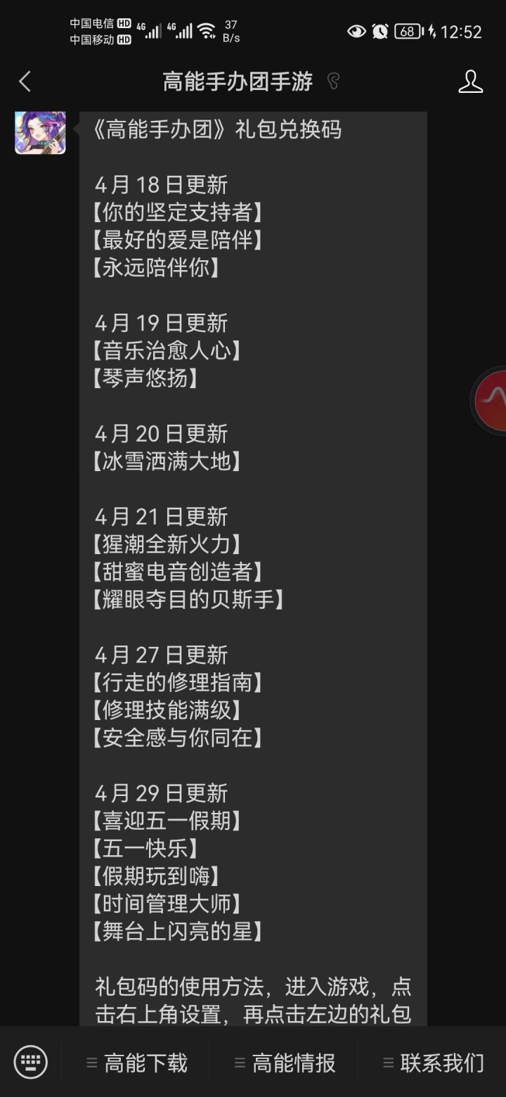 最新兑换码😈😌😍😚😘😛〔■顺带帮大家识别文字了😋〕高能手办团手游《高能手办团》礼包兑换码4月18日更新【你的坚定支持者】【最好的爱是陪伴】【永远陪伴你】4月19日更新【音乐治愈人心】【琴声悠扬】4月20日更【冰雪洒满大地】4月21日更新【猩潮全新火カ】【甜蜜电音创造者】【耀眼夺目的贝斯手】4月27日更新【行走的修理指南】【修理技能满级】【安全感与你同在】4月29日更新【喜迎五一假期】【五一快乐】【假期玩到嗨】【时间管理大师】【舞台上闪亮的星】