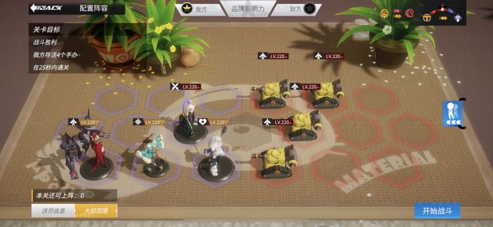 如图所示站位,小概率23秒,极低概率21秒,理论上存在极极低概率19秒。这关竞速要求全程手动,不然托管正常27秒过。手动第一步,法师大招保留,新前排大招正常释放,玲的大招释放后接法师大招,(等待对面的小怪炸死玲的箱子后接大招使召唤物不溢出,另外召唤物爆炸伤害是这关竞速的主力,这里需要拼脸,炸不掉箱子就重开)之后正常释放辅助大招。手动第二步,射手大招保留,等待后手收割。之后新近战和玲以及法师第二