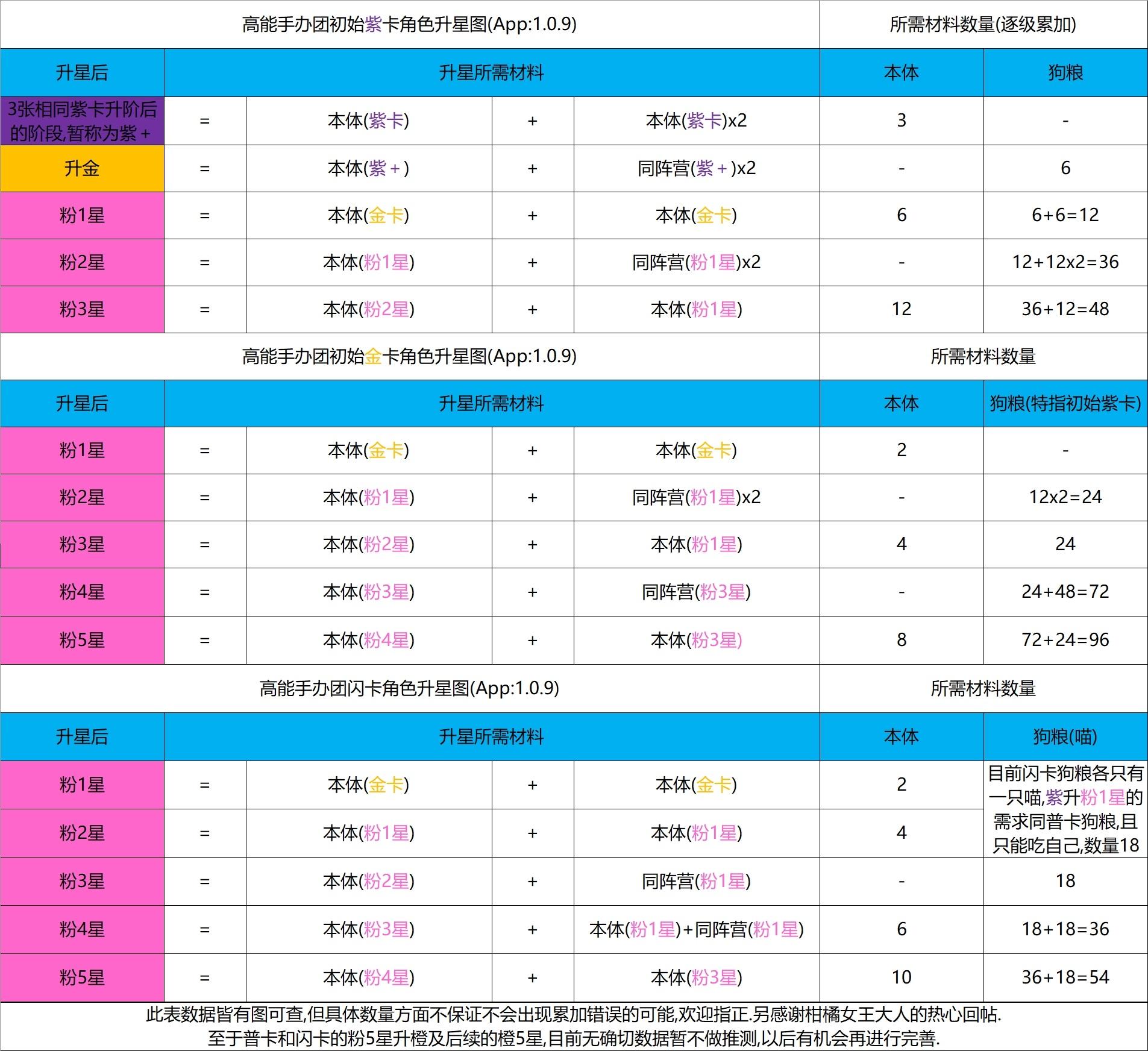 首先附上原帖:数量来源见回复,楼主负责整理.普卡和闪卡现在都确定到粉5星,升橙后面的阶段待有确切数据可证时再补(感觉遥遥无期,指望有大佬进来指点).另外需要说明这表仅限定游戏版本为1.0.9版.看官方预告,23号的更新不知道会不会修改角色升星条件.