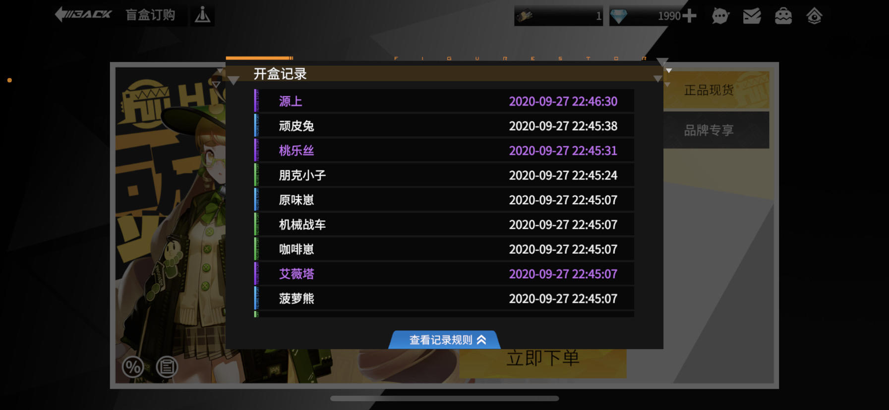 话不多说直接上图,因为开盒记录精确到秒,所以不存在不同时间段截图截一起的情况。除此之外,抽奖抽奖很多次了,我到现在都不知道卡池里都有谁,概率又是多少,只有金色紫色的概率,没有具体角色的概率。我记得这个抽奖概率公示是有对应公开要求的吧?我之前要的所有游戏都会有。按照盲盒计算的话,bilibili和泡泡玛特这些盲盒我也买了不少,每款都会有盒内娃娃池子的公示,但这个游戏我完全没看到?还是隐藏在哪个小角