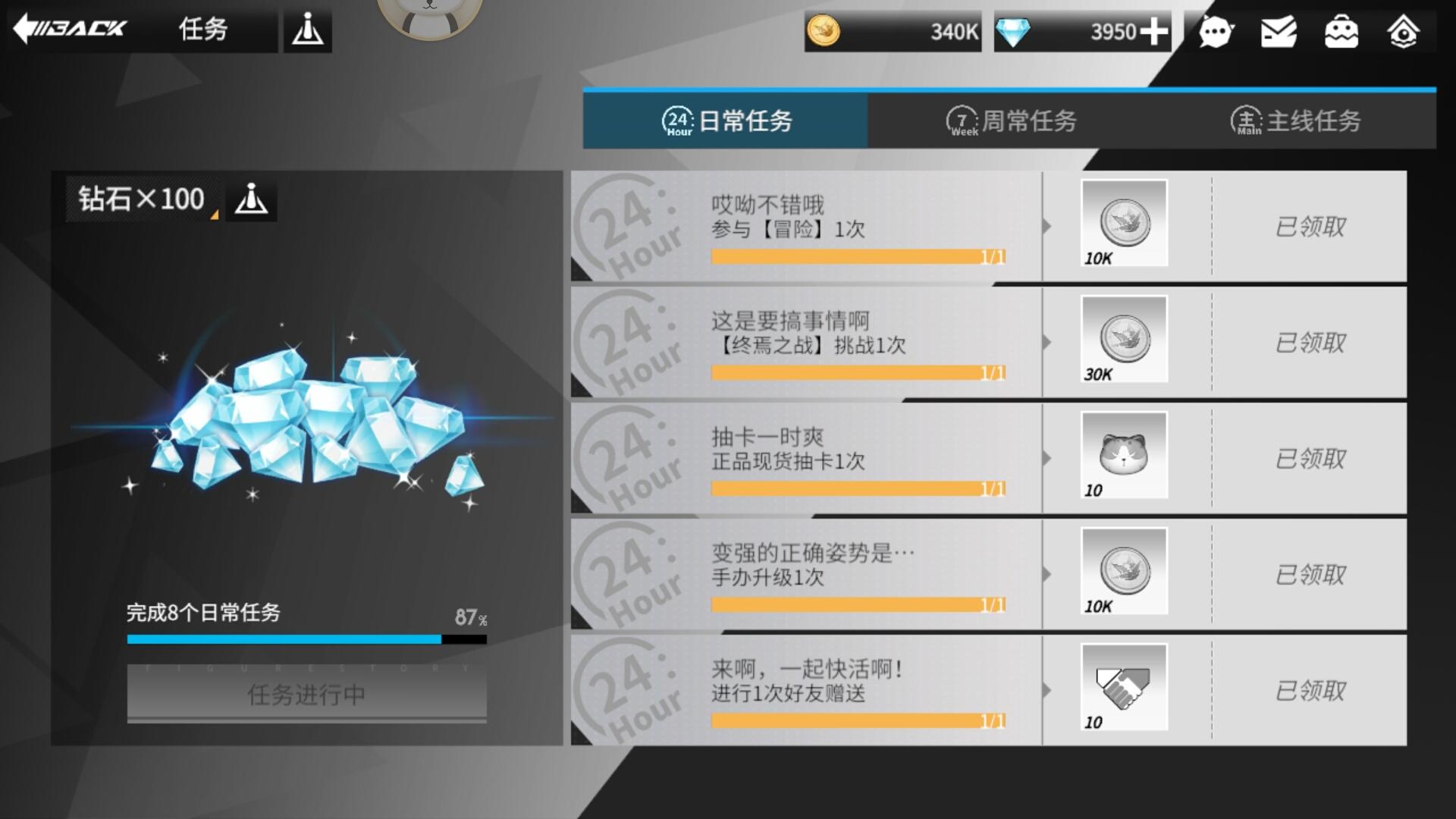 第一,一个完整的章节里,究竟有多少关卡?现在是2-20了,什么时候才能刷到3-26?第2,听说完成8个日常任务就可以得到。100个钻石作为奖励,而且我已经完成了所有任务,但我数来数去,发现总共只有7个任务……这100钻石是大饼?还是水彩笔画的?