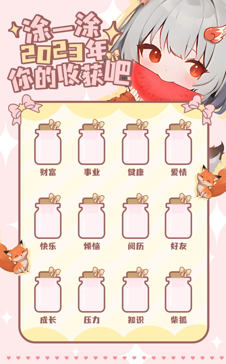 尊敬的收藏家们,本期活动结束啦,恭喜如下玩家获得高能手办团送出的奖励哦,请在开奖后的7个工作日内联系官方管理员领取奖励哦,添加下方QQ号即可,建议备注“领取奖励”。QQ:2064807015马上要开始新篇章啦各位收藏家们~你们准备好了吗?今天柴狐准备了一些“收获瓶子”大家可以保存下来涂一涂2023年的你都收获了什么?我相信一定很有成就感吧可以将涂完瓶子的图发到评论区和大家分享哦【