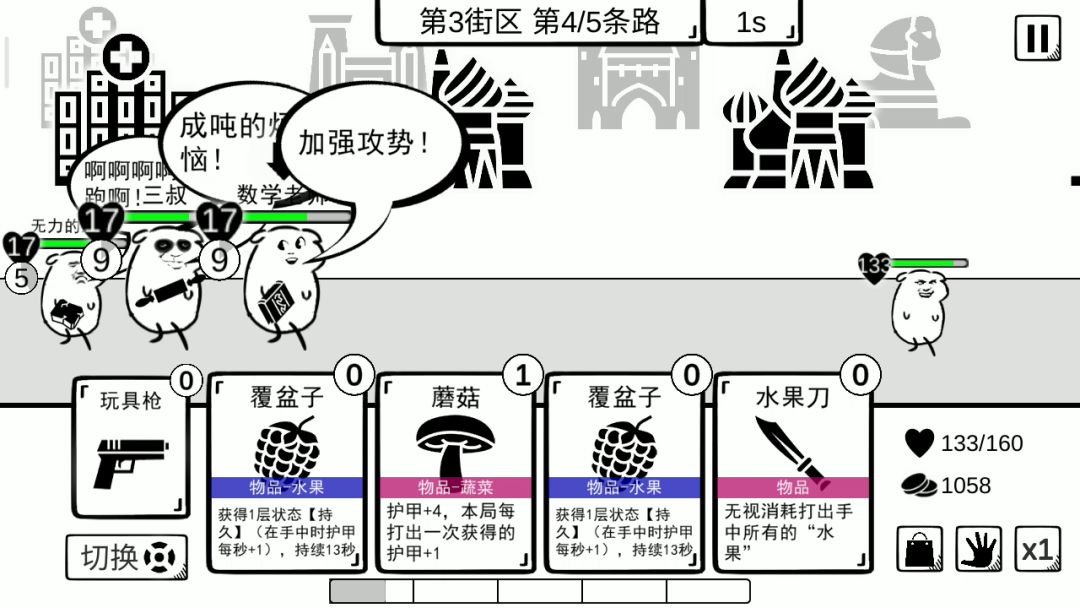 我目前是打到28关,基本上没咋输,除非真的脸黑 开局辣鸡食品 玩法:第一条街道靠 开幕雷击 来通,不进体育馆,优先进学校,第二进小卖部,把辣鸡食品买满,后面只需要一把勺子 或者 女装 即可无脑通关 还有水果 玩具 这两个玩法也不错