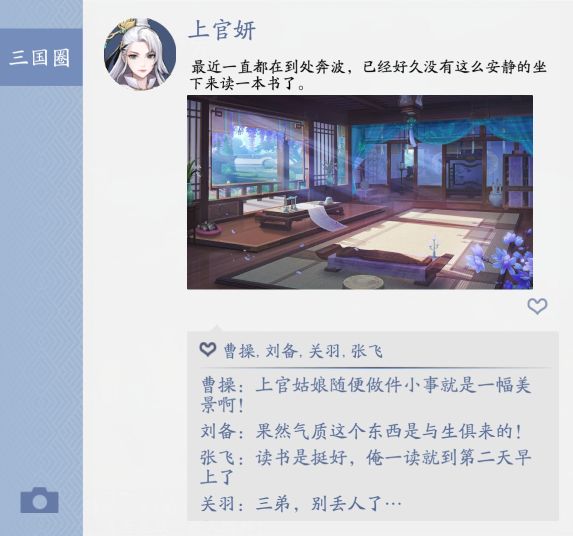 说起朋友圈少主们一定都不陌生少主能将自己的所见所想与其他朋友分享还能与志同道合的小伙伴们点赞评论那么问题来了你听说过三国圈吗?假如三国人物也会发朋友圈他们会是怎样的一种画风呢?↓↓↓读万卷书,行万里路上官妍小姐姐的生活也是非常的雅致呢~小桃脑补出了一场吕关张的爱恨情仇大戏!评论里的后援团非常亮眼了~您的好友董卓开启了嘲讽模式董老板人气日益低下呀,都没人点赞评论…看起来好有哲