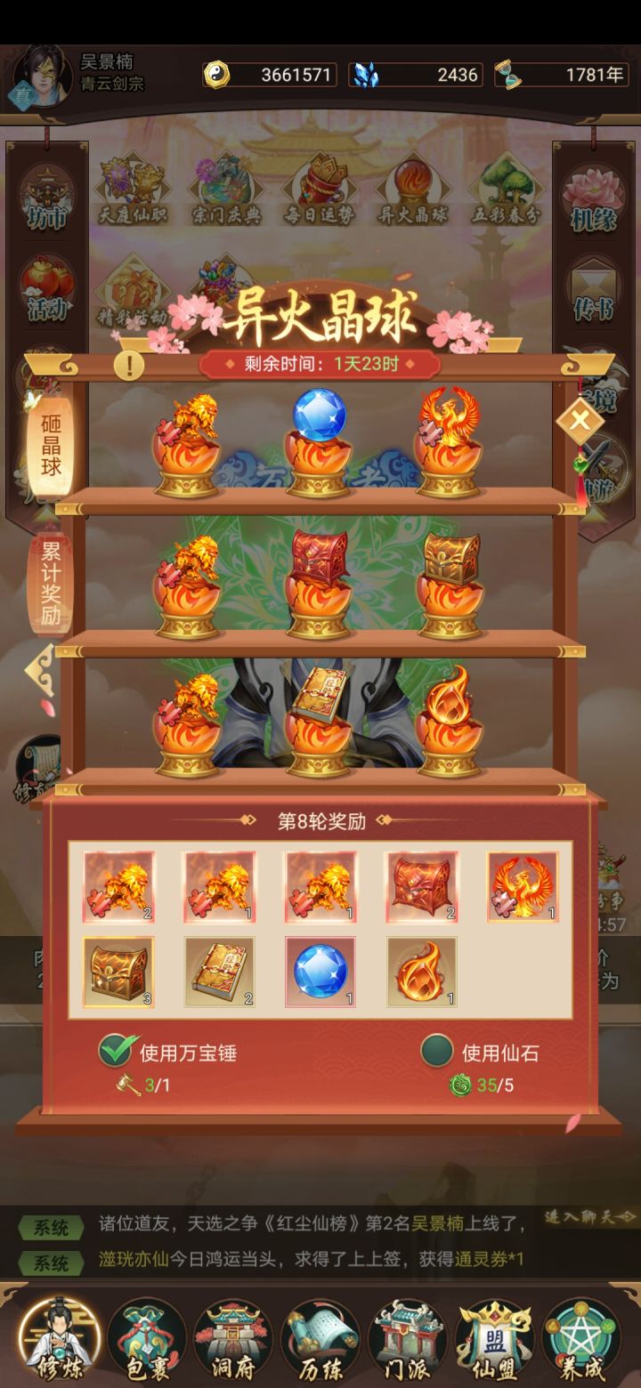 这个异火晶球就8轮,说明上也不写,第一天就做完了,每天三个锤子领完用不了,客服我需要补偿