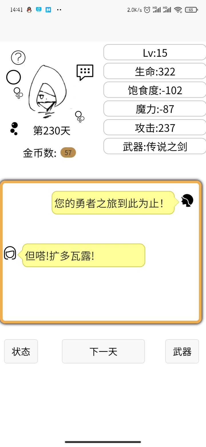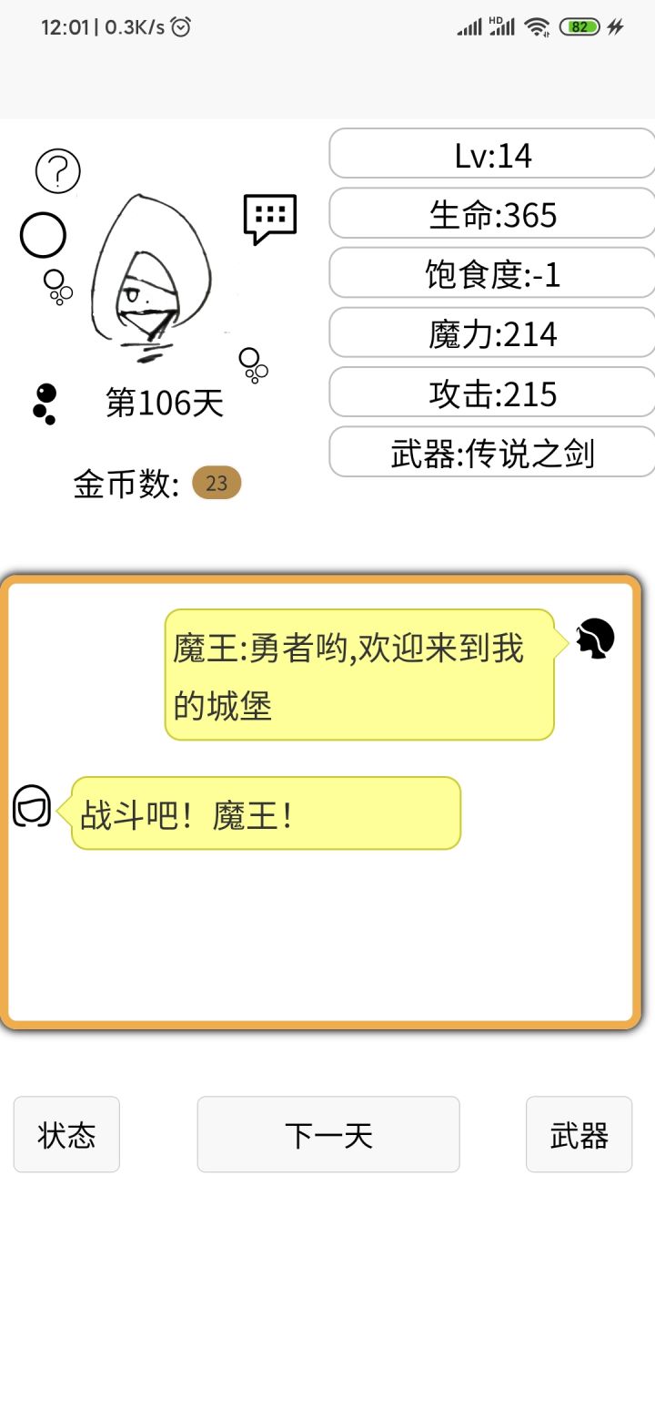在战斗结束后,左上角会有一个返回箭头,按下后,游戏界面变成了我重新开始之前(之前的档失败了)的界面了,按下武器和状态没有反应。按按下一天按钮会偶尔触发事件,伤害和新档相同。