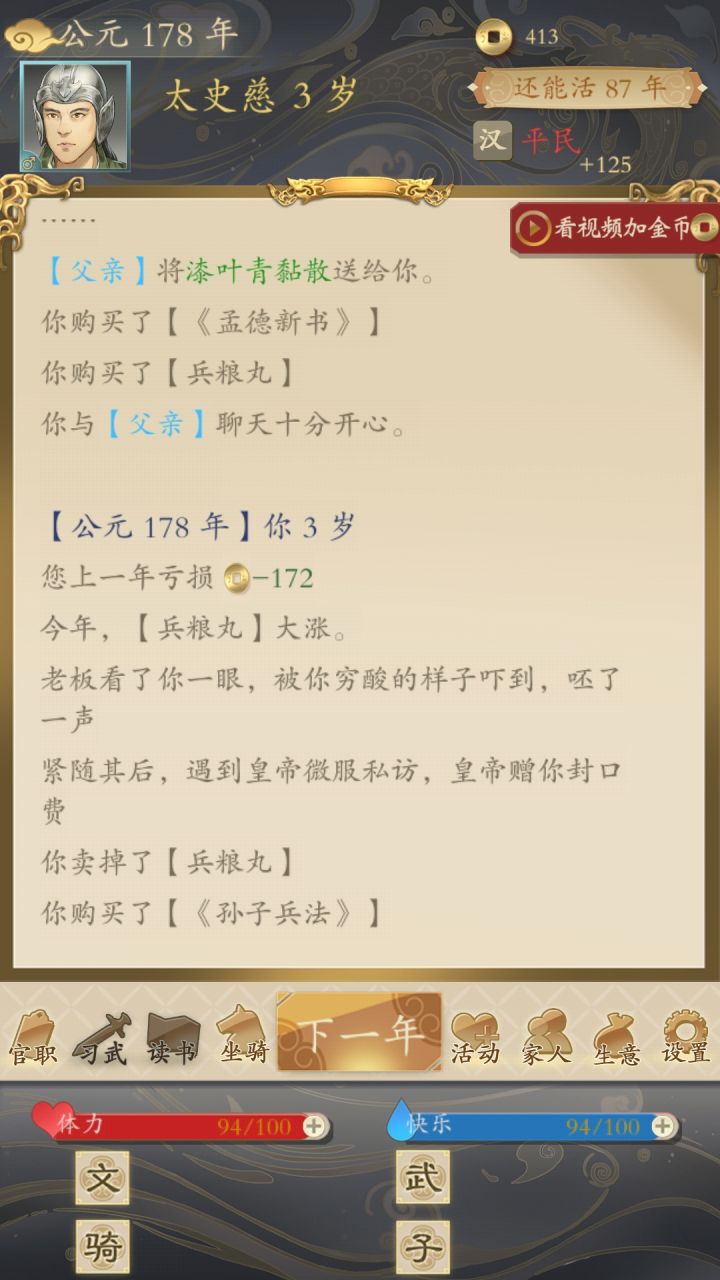 。。。。6岁关羽和父亲讨论谁是三国第一武将,在关羽与吕布间起了争执?怎么的,这是预知未来了还有一个bug,如果在狩猎时猎到了四不像,点不了广告,那再点继续,体力值就不加了。。。。