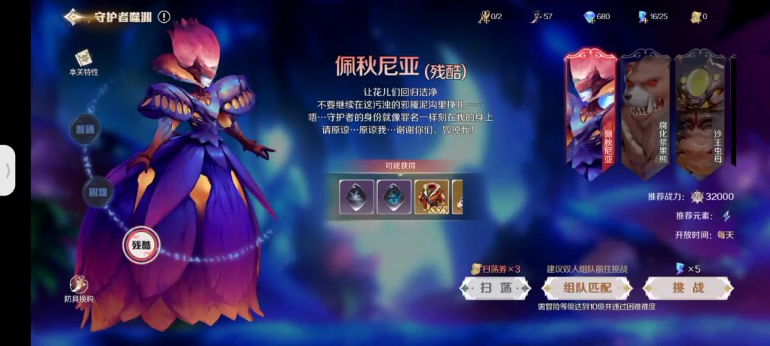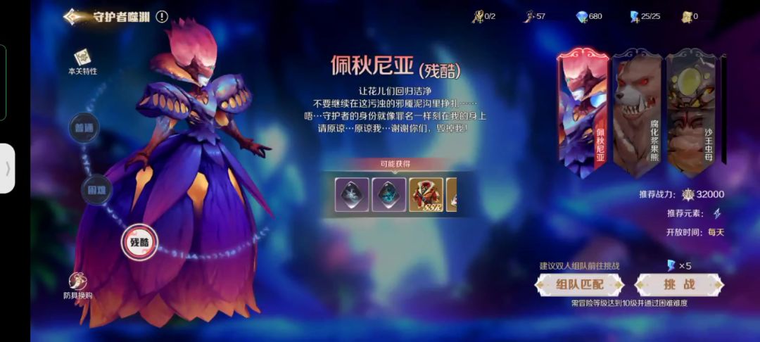 困难难度和残酷难度的花都没有蹦床,需要玩家用女主的上砍,上挑,回旋风车或者男主的技能将它打下来,之后进入花的第二阶段,boss会释放小怪,荆棘刺,和风刃,注意躲避,boss可以用雷属性的武器克制。#灵契少女