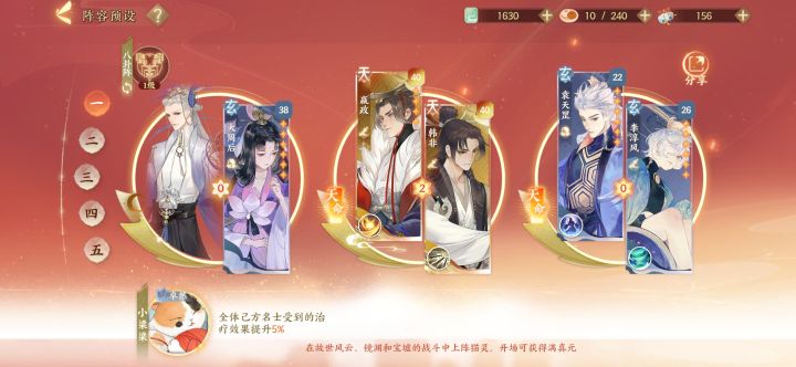 首先此阵容受启发于,大家可以结合原贴自己思考,我改后的阵容如下:配速大周后(灼华)>袁天罡(灼华)>嬴政(踏破)>韩非(踏破)>李淳风(踏破),以开局满能为例,大周后拉嬴政一波大,袁天罡立即补满嬴政,韩非刮痧+补小怪伤害,保证李淳风大能全砸首领身上。如果一轮砸不死的话,第二轮嬴政又是一轮大。阵容注意点:嬴政星级较低的情况下,要注意控制其余的装备或等级,保证嬴政攻击最高,自动不翻车。没有韩非怎
