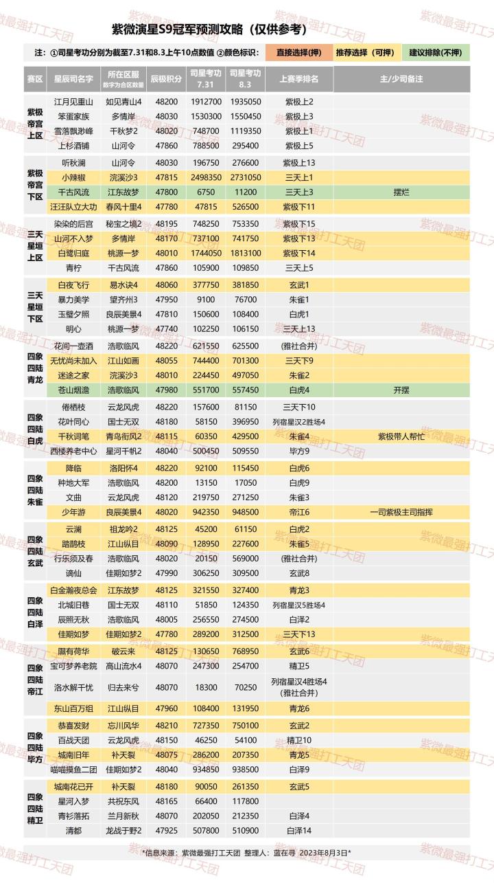 冠军预卜部分标识说明红色:该赛区四个星辰司共同商议决定由该司获得冠军;黄色:根据信息与对阵表各区选出1~2个推荐星辰司;绿色:主司少司提供不争冠军的信息。————————————————✨特别感谢紫微最强打工天团✨欢迎全服星辰司主司/少司/指挥、雅社社长/副社加入天团!本团主责:紫微演星玩法讨论、预卜信息讨论、对阵双方布防约定等。(要加入的宝子请小窗我[送花花])