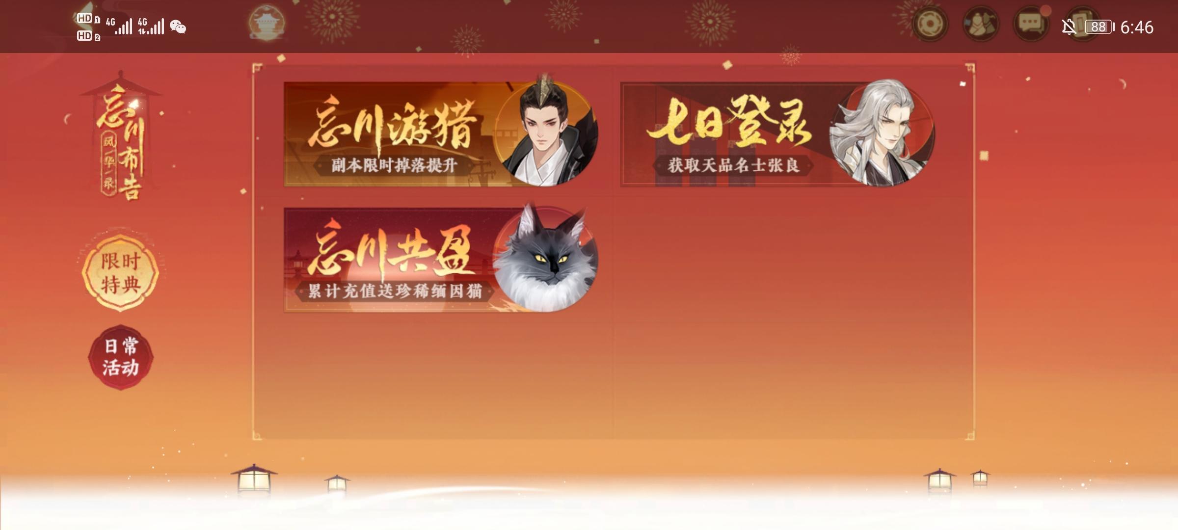 取消活动时间限制或者修改限时活动(修改建议后面会说)。首先玩这类游戏都是抽零碎时间玩,不可能一天到晚有时间玩游戏,有时间限制的活动(例如中午几点到几点)可能就参加不了。取消限时,例如:金戈(PVP玩法),我体力刷完了,没事干想去打架,可惜时间限制没法玩。只能下线找别的游戏玩了。建议取消限时。如果一定要弄个限时PVP玩法,可以弄个公平PVP玩法,玩家进去可以使用所有的满星满级名士,装备随意选。可
