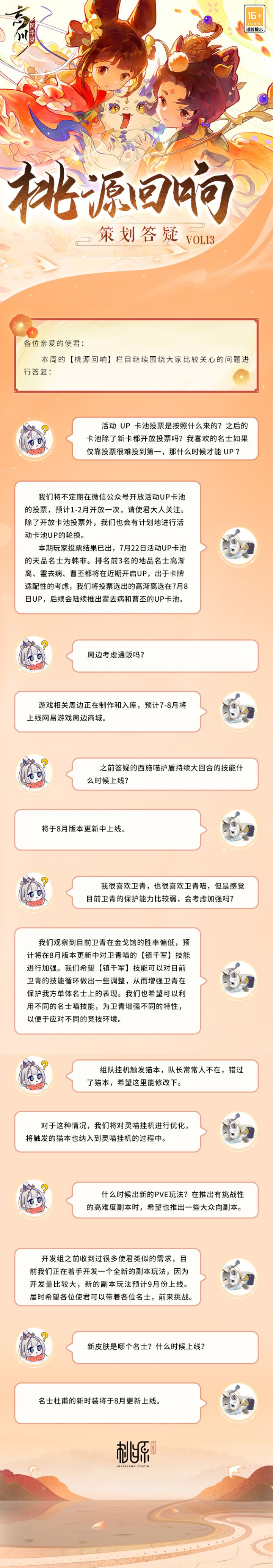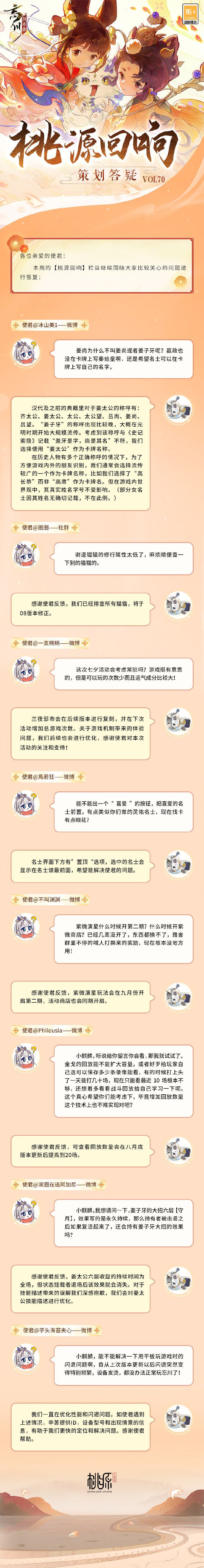 【桃源回响 策划答疑Vol.70】小麒麟整理好了本周的答疑内容,请使君大人过目。姜太公卡牌名称和技能描述、猫猫修行属性修正、金戈回放可查看数量增加……更多使君大人关心的问题,都在答疑中。美好忘川桃源,与使君共筑!欢迎使君大人在评论区留下问题和建议,小麒麟会及时收集反馈~☆加入官方社群,交流兰夜邸市活动攻略,赢取专属社群福利:☆官方社群:319552653