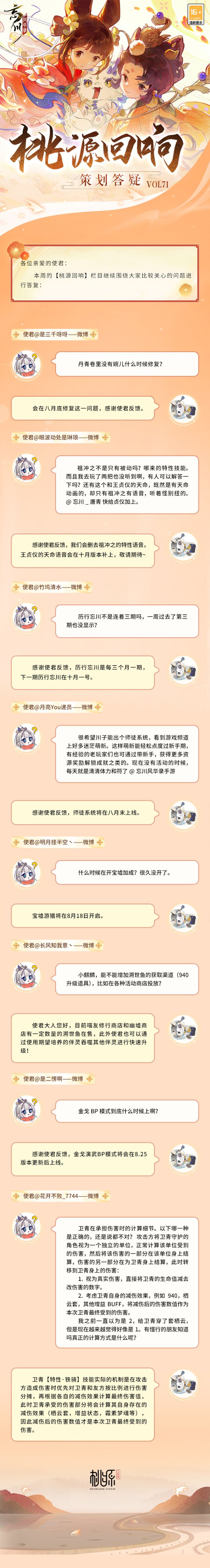 【桃源回响 策划答疑Vol.71】本周最新答疑内容小麒麟已经整理好啦,请使君大人过目~师徒系统、宝墟游猎、金戈演武BP模式、卫青技能机制、历行忘川……使君们关心的问题,都在答疑里。美好忘川桃源,与使君共筑!欢迎使君大人在评论区留下问题和建议,小麒麟会及时收集反馈。☆加入官方社群,交流姜子牙攻略,赢取专属社群福利:☆官方社群:319552653