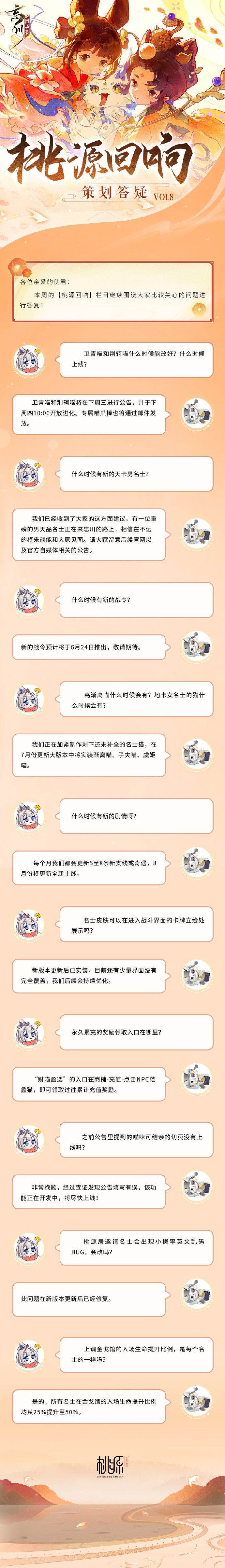 使君使君,小麒麟带着本周的策划答疑为解惑来啦~卫青喵和荆轲喵什么时候上线?永久累充的奖励领取入口在哪里?本期的桃源回响都有答复!