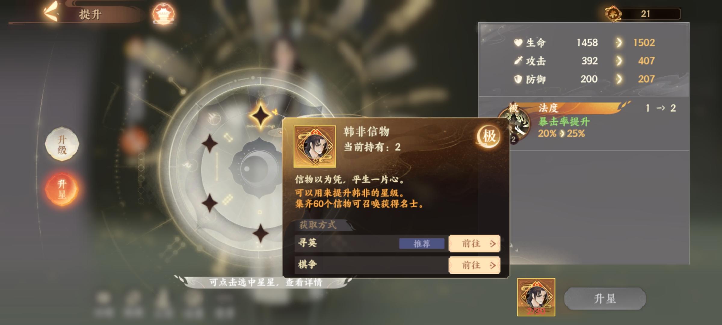 如图,地极名士的升星这里就有一个加号,可以用信物但是天极就没有了,救救孩子,信物到底怎么用啊……【泪】