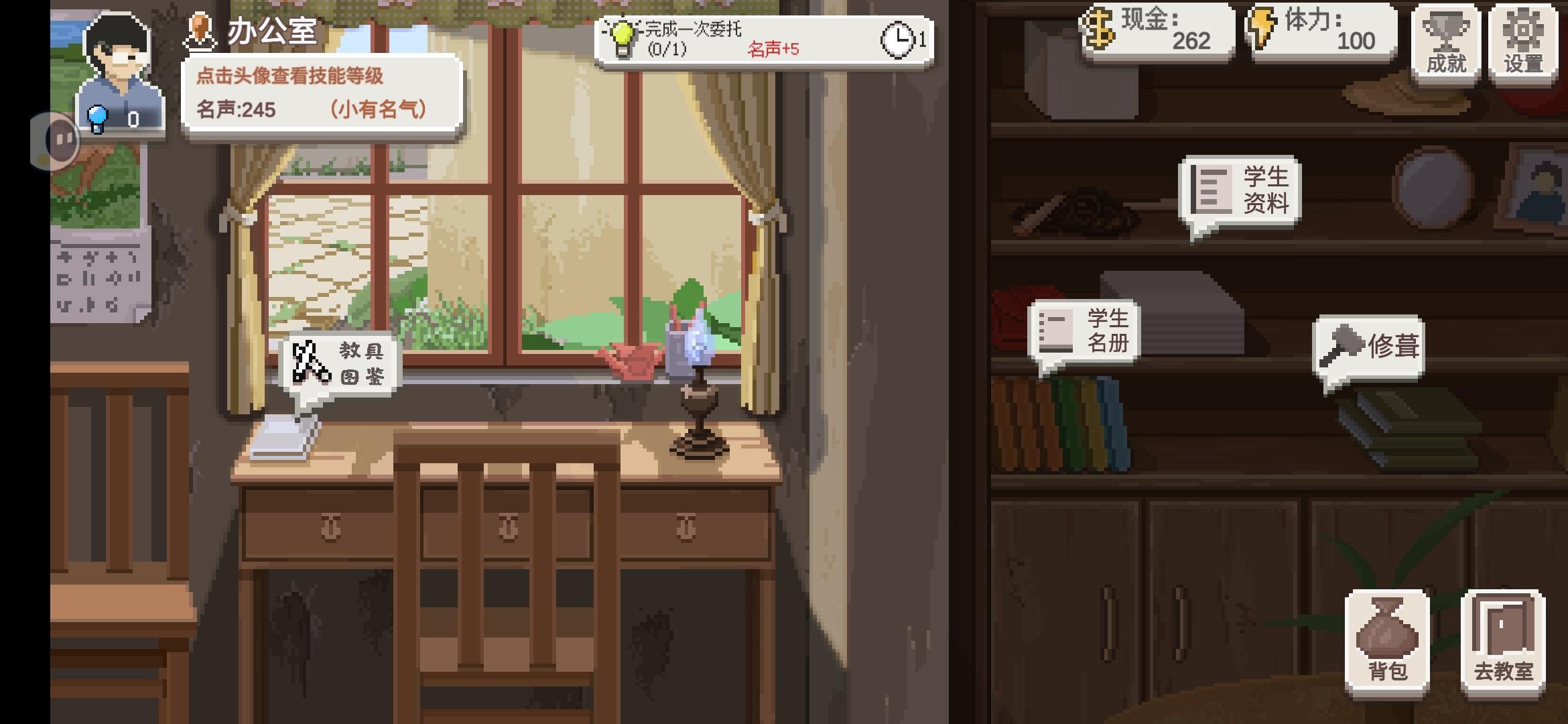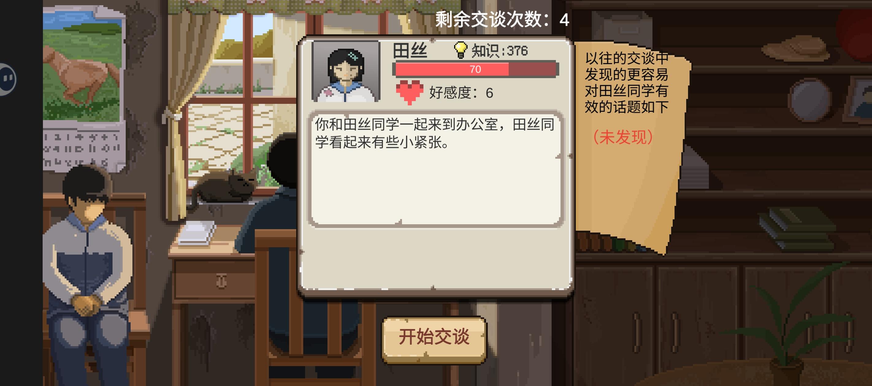 玩了一下,还是感觉复杂了,还有滑动的时候很别扭 和我的习惯是相反的,一个学校就自己一个人不太符合常理,加个女老师还有一个坚守了几十年的老教师皆校长好一些,女老师是老校长的女儿,可以发展感情线,然后就是上课卡牌可以再简单一点,时间设定不要定在几天后就期末考试,时间可以一个星期一个星期的跳,还有厨房可以要NPC负责,但主角从大地方来的可以展示厨艺,不要什么都要主角亲力亲为,每个学生都可以发展出一些问题