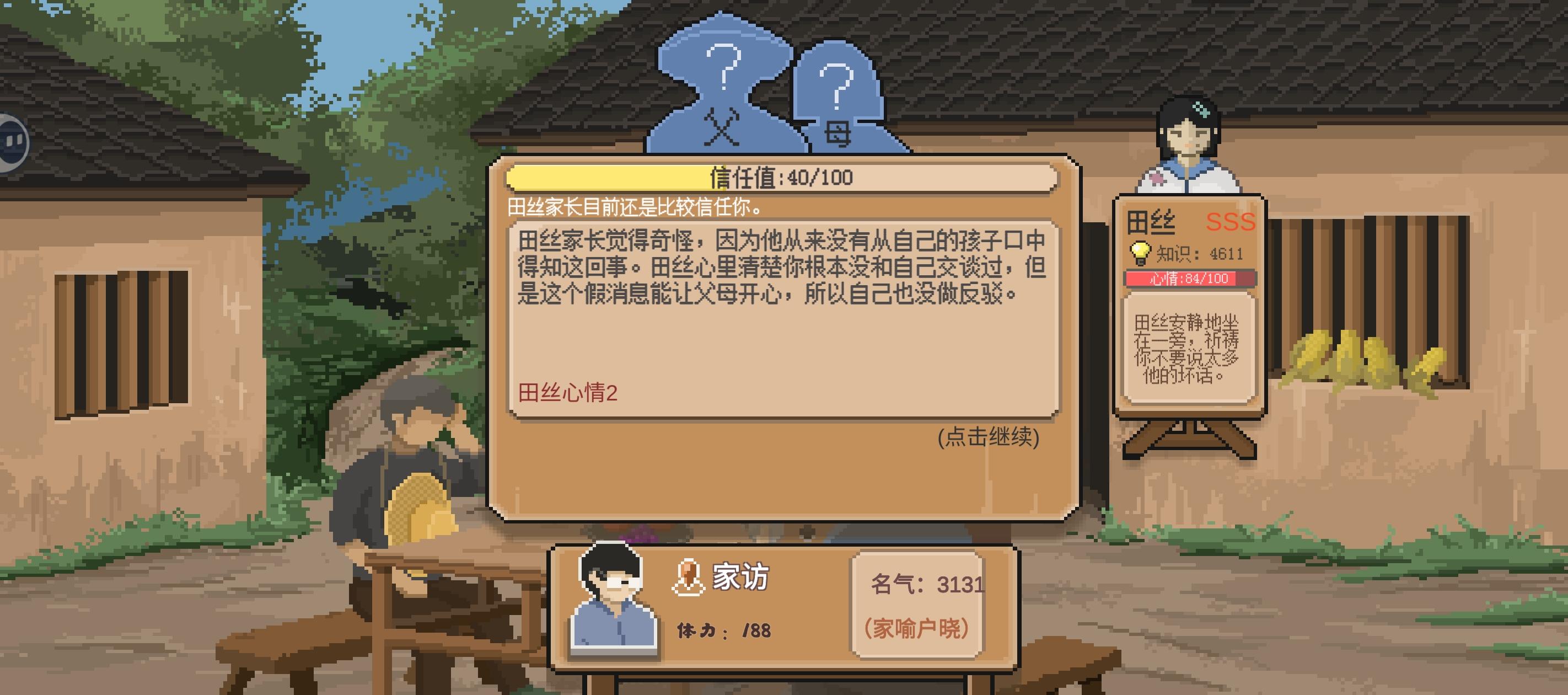 很好的游戏,我玩这个游戏想了很多,第一届学生我探索半天才搞明白怎么玩,必然的,他们大部分人都落榜了,起初我没有任何感觉。直到第二届学生的到来,我明白了游戏的游玩方法和运气好获得了很好的道具,把他们都送上了镇上的重点高中,不是最好的,却也算走出了大山,里面有个孩子彻底改变了我对这个游戏的感观。他叫董文石,这个班里他不是天赋最高的也不是最差的,但上课总是不专注,学到的知识很少,我第一次找他谈心,他缄