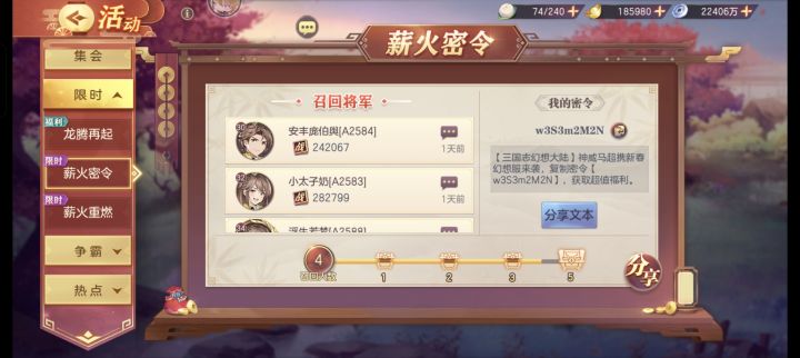薪火密令∶w3S3m2M2N,还剩一个位置。#三国志幻想大陆 #三国志幻想大陆兑换码 #三国志幻想大陆攻略 #三国志幻想大陆礼包码