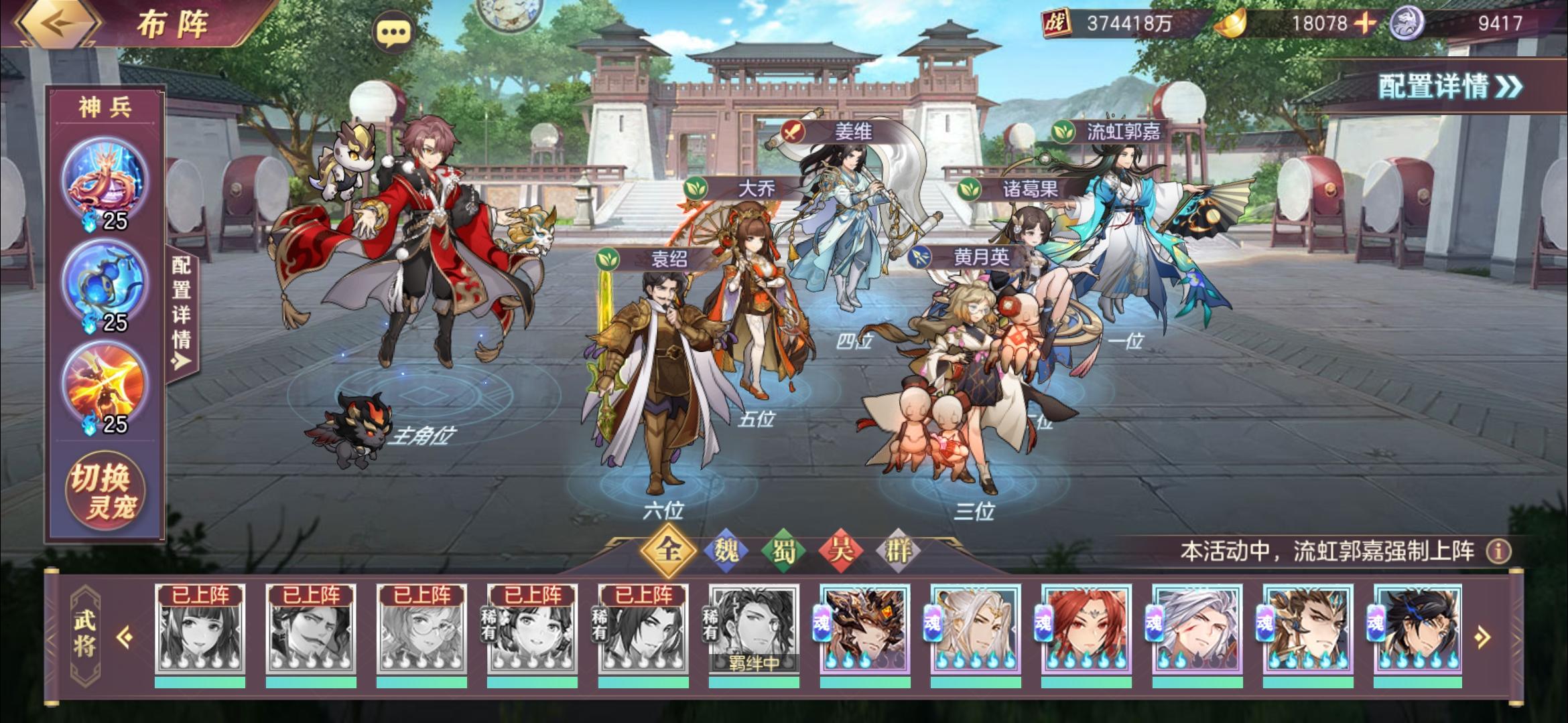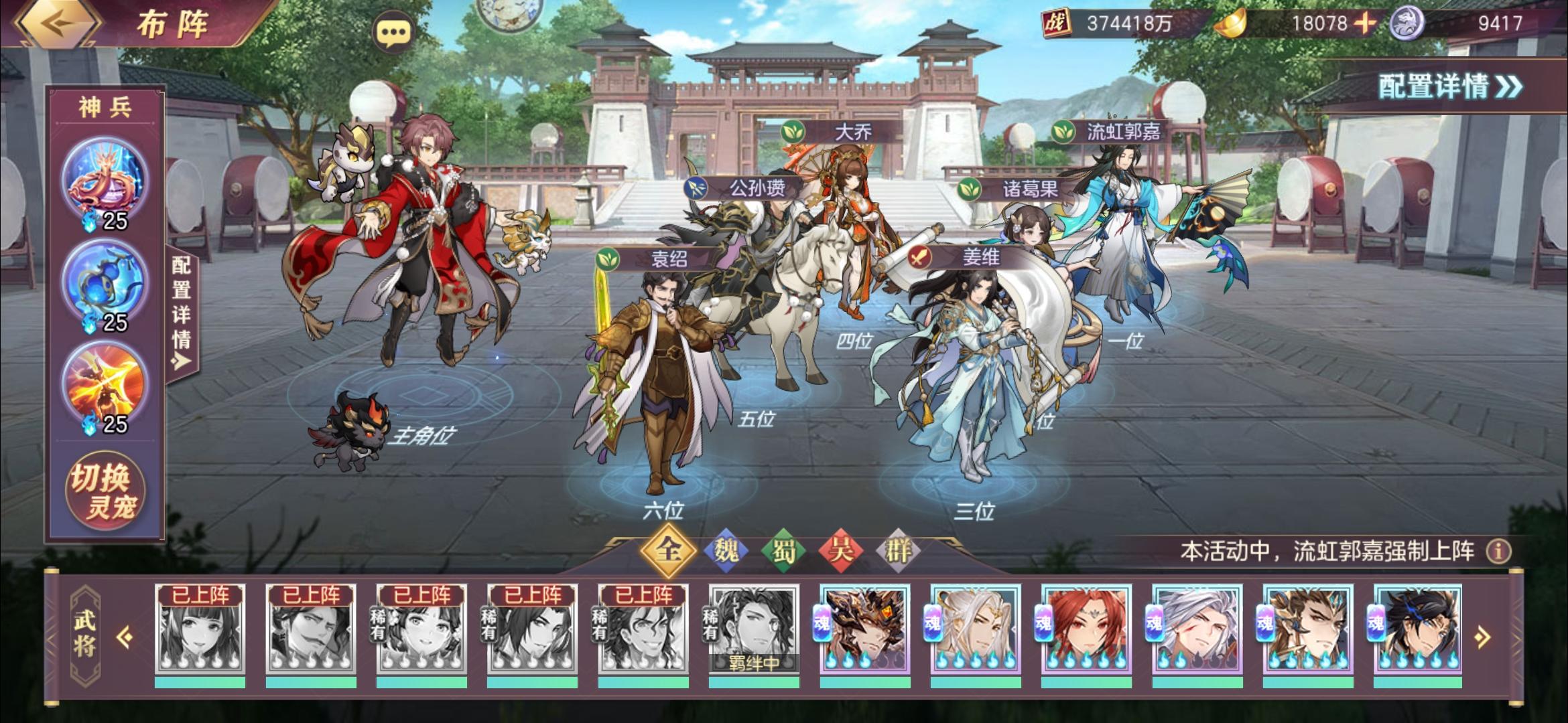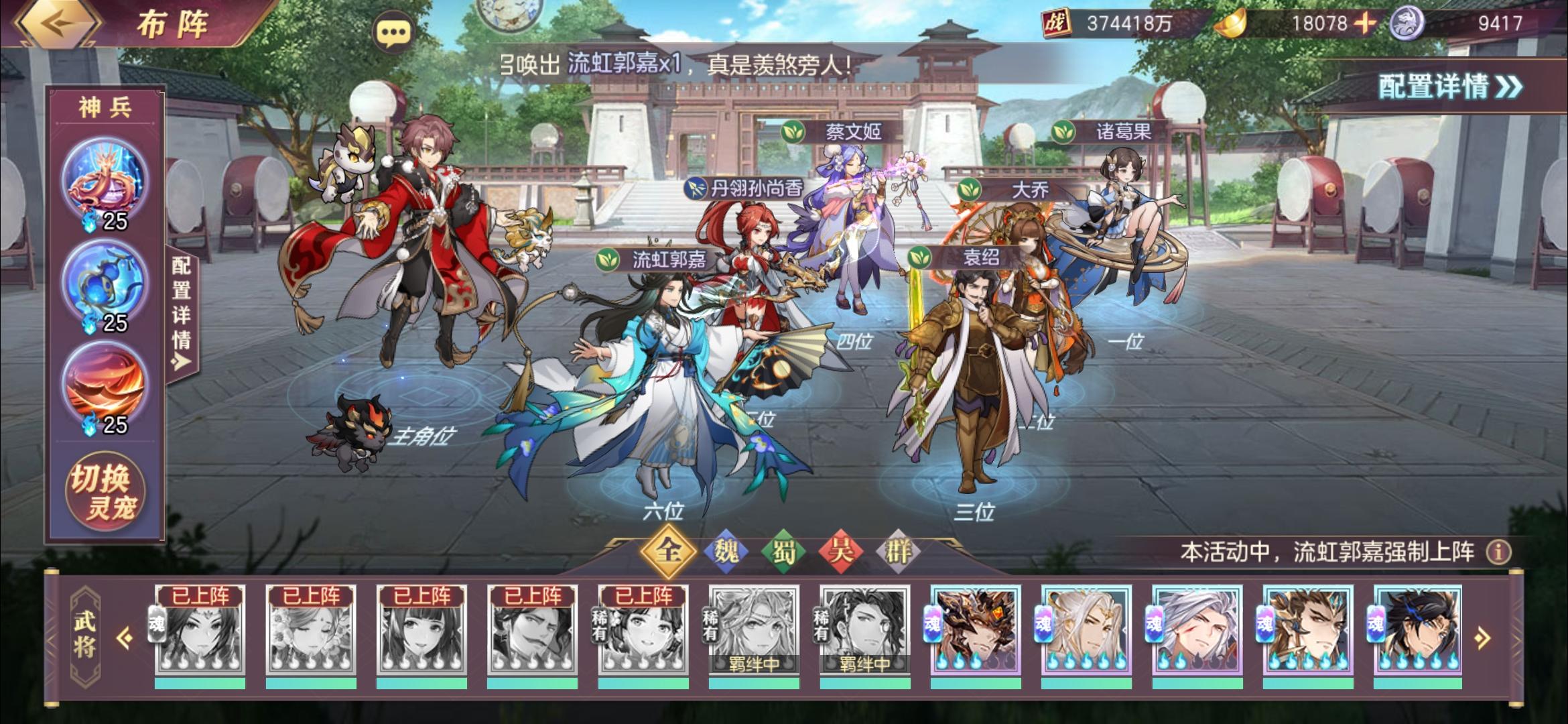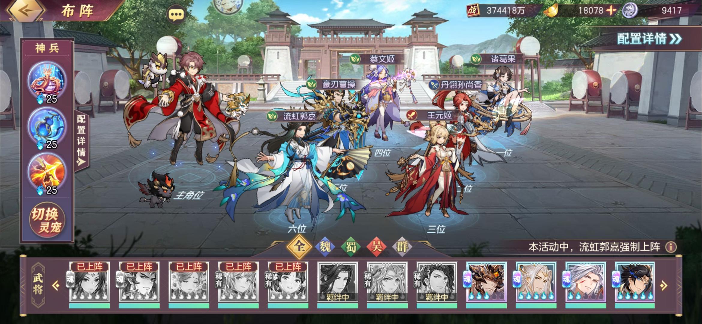 抄排名榜前五丹香大佬的阵容,实用性很高但是阵容偏脆,不适合打灭,打火烧,丹香一炮秒,我很喜欢,将魂上面抄排行榜就行,这号配置不太行新区建议走这套,蔡文姬本来就要弄(第一期),貂蝉必搞(山河第二期)只需要多弄和甄姬武器,问题不大,这套贼肉,打冲锋姜这种叼毛很舒服,详情翻上个帖子