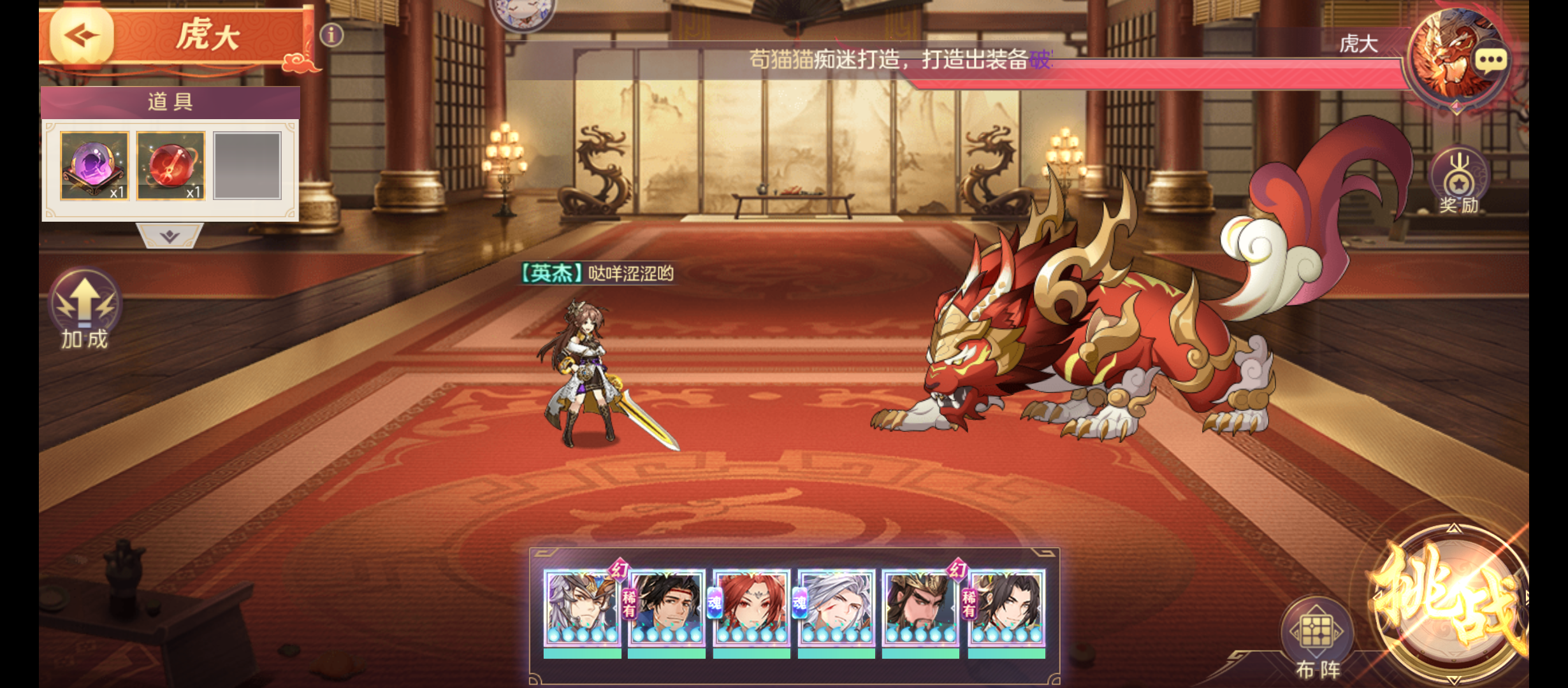 虎大5000满阵容灵宠带的鹿主站,穷奇助战,还有一星火麒麟。灵宠没研究,应该可以配白虎。但由于这次是直接从40开始,所以没那么多灵宠。就是选的有的里伤害高的。战魂输出都带的弱点,果果回怒气,曹丕长驱。天赋带暴击,爆伤那些看着点,不要点低血加伤那些就好,主要点那些高血加伤的。boss血线一直不变,也打不掉武将血。专武只有马超上了专武。这应该很好凑,不过要打几次,稳定4000+,多打几次可以破5000。