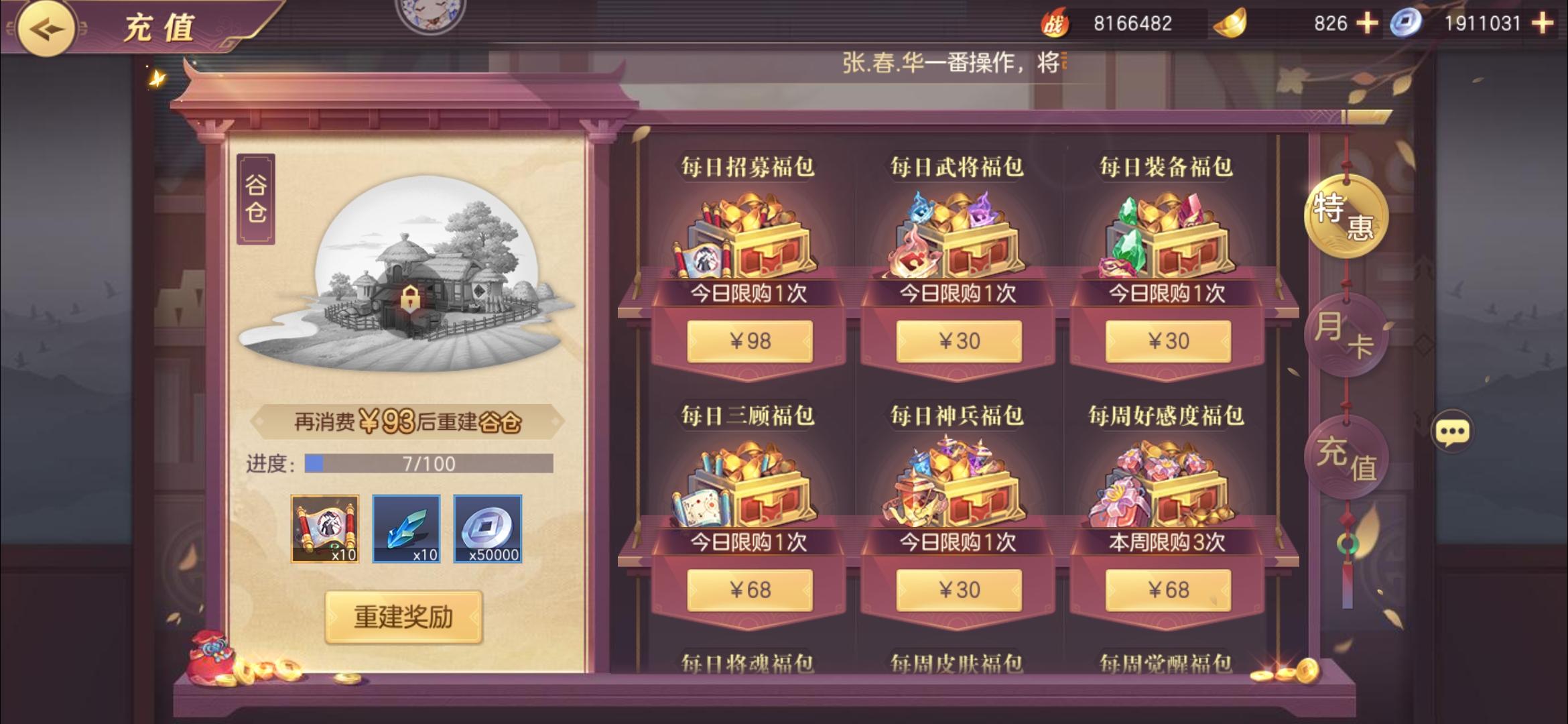 我一共氪了两个月卡,十几个包子,提前五六天拿到了时装。首先说结论,在新区氪100-200拿到第一套皮肤是完全可行的。要点:1.元宝全部用来抽卡,拍卖三顾不碰2.任何活动白嫖优先觉醒石3.加好感度的礼物尽量都买,看进阶需要送礼物,不要一股脑全部送给某一个,不要完全平均的送给所有武将---------------分割线-------------关于元宝的来源:1.找一个最新的新服,迅速