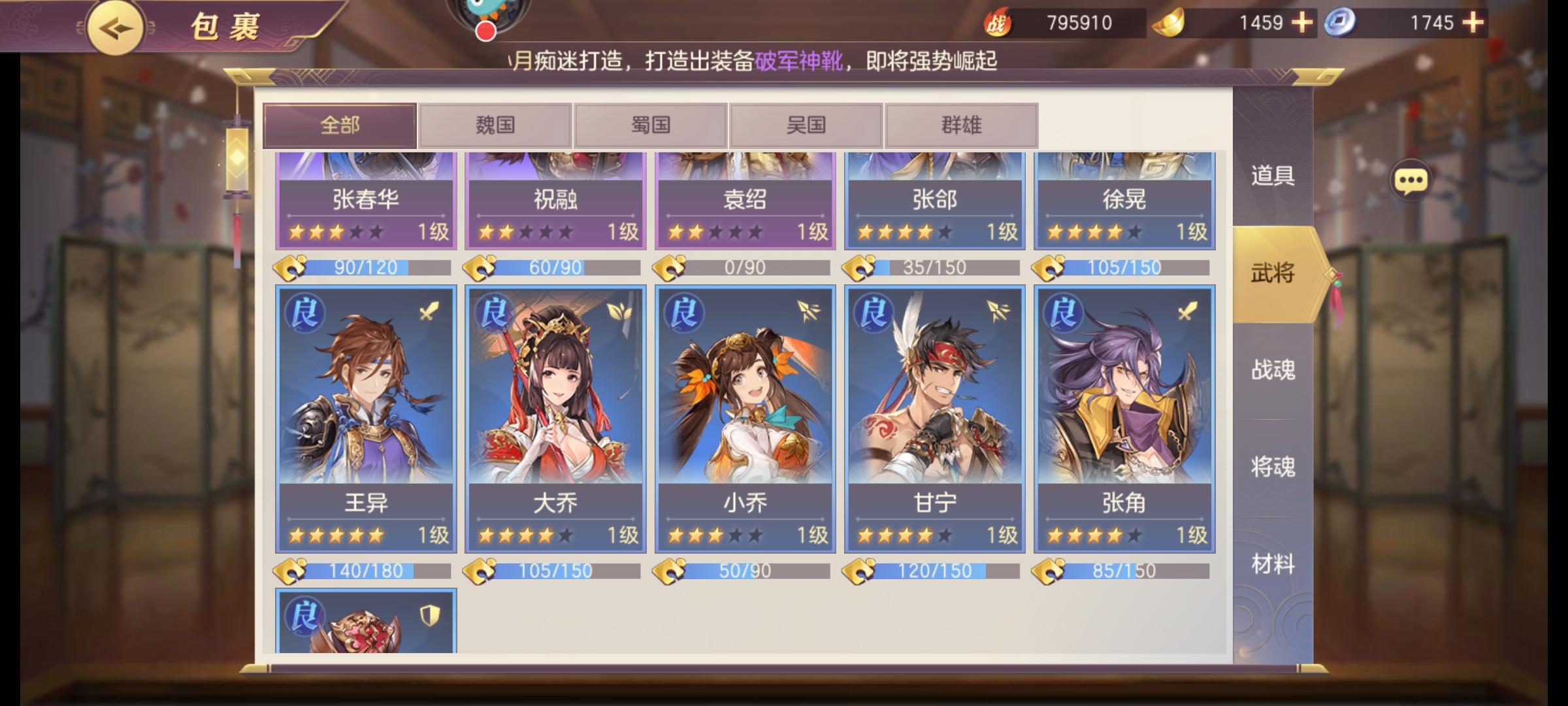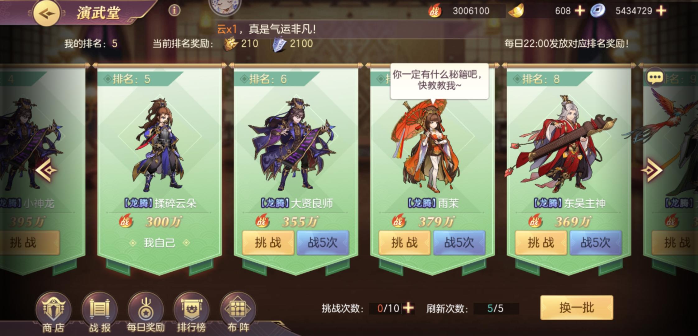 论坛里面看到两个三百万解锁一个刘关张一个吕布奈何没有突突突得可以拿我这个试试。1董卓2魏延黄忠3马超诸葛赵云,诸葛带的肉战魂。