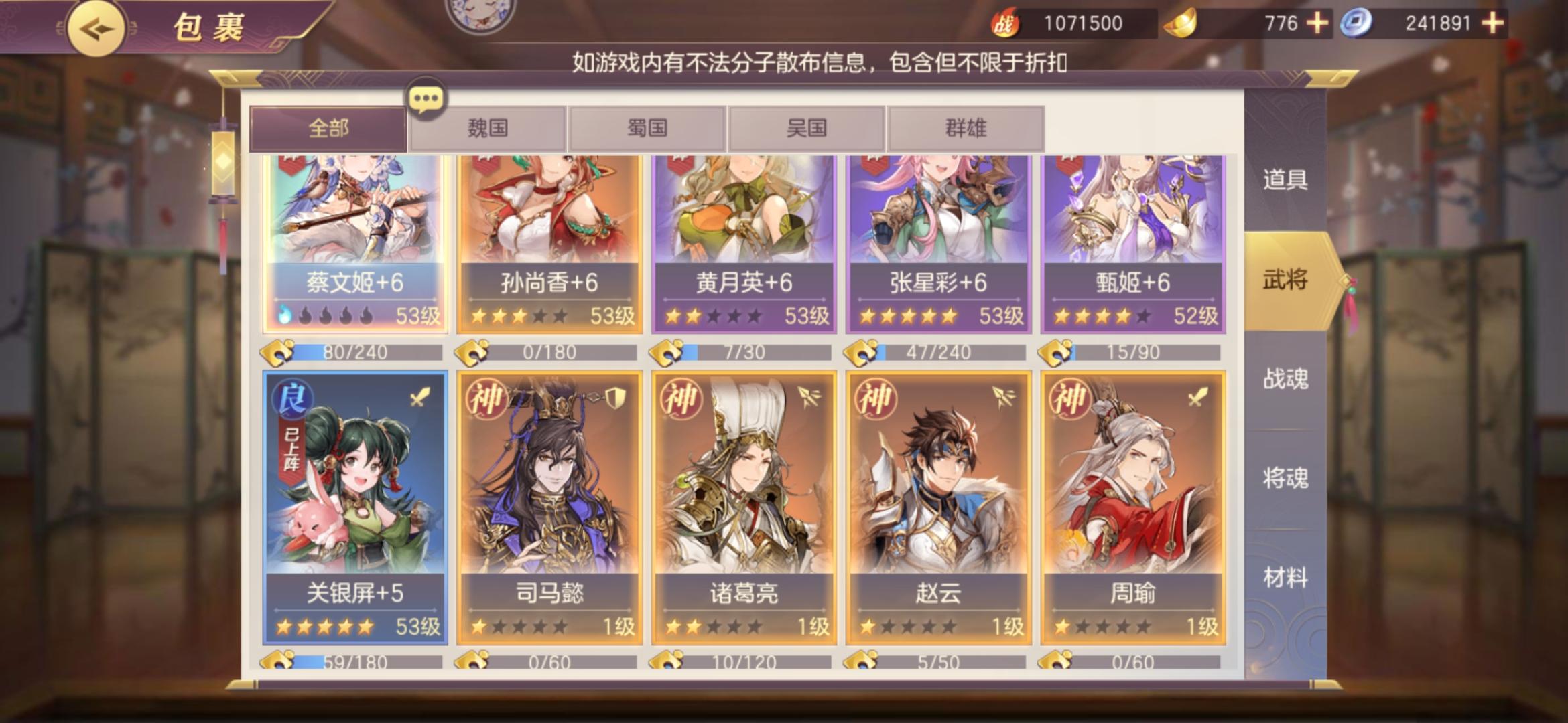 1.前期别盯着神将看,没用,最多用两个,蓝卡紫卡一样用,也能成神将,而且还是高星。2.要不万氪要不不氪,要不6块。3.合理运用元宝,这游戏仓鼠不行。4.游戏和生活一样现实,别以为能找到存在感,那是从前,不要和氪金大佬比,很累的。5.很多人问队伍,前期最舒服的就是女队,好养活,后期要换的,不可能一直用,没有能一直用的队伍。6.玩游戏要明白是你玩游戏,而不是游戏玩你,主动权永远是在自己手上。