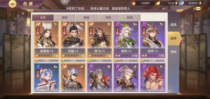 爆率还是挺奈斯的70抽出了5个(零充),就是不知道咋搭配大佬们给个建议🦆(良将全有,名将差周泰步练师和祝融)