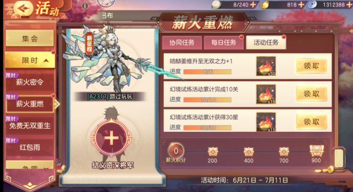密令填写即可获取10张招募卷:X2W9p3J5h活动地址:活动(体力下面的灯笼图标)-限时任务的薪火密令菜单中填写结义游戏id: 114240001000290