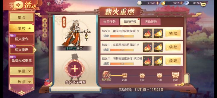 A服活动菜单-限时任务的薪火密令菜单中填写下面密令可获得10张招募卷,密令:X6j3F4f5U结义游戏id: 114240001000290