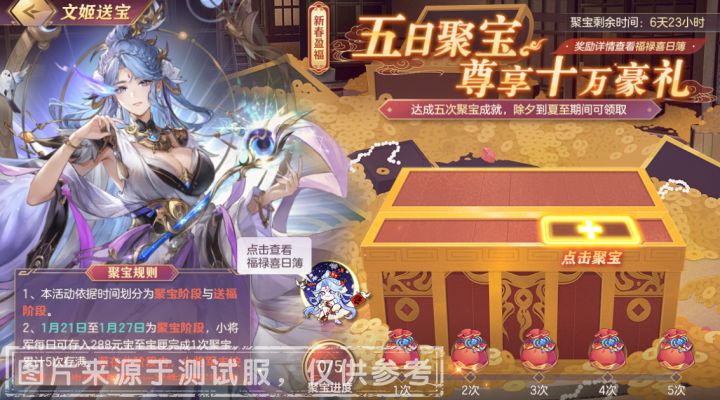 亲爱的小将军:朝朝福星高,暮暮好运绕!全新福利活动“文姬送宝”重磅来袭~新春盈福,福星高照~在1月21日至1月27日聚宝阶段,小将军可每日存入288元宝至聚宝宝匣完成一次聚宝,累计存满5次即可完成聚宝目标。1月28日将进入活动送福阶段,此前存入的元宝将膨胀至价值十万元宝的豪礼(具体奖励详情可点击【福禄喜日簿】进行查看)。小将军可在除夕至夏至日期间登录游戏领取豪礼。祝小将军们聚宝多多,财运满满!