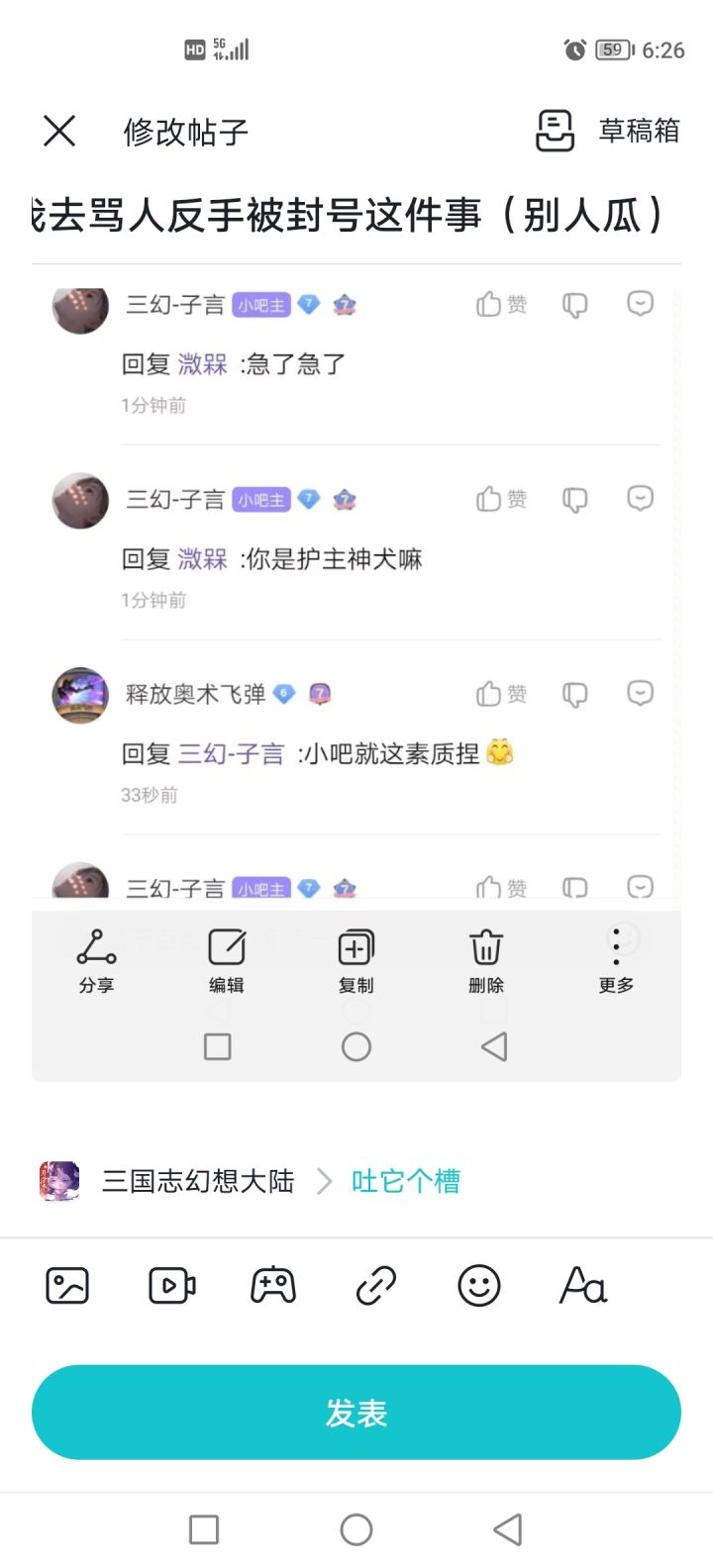 图片都被屏蔽了,我补一下截图,两个人都有错,三幻管理就刀自己人,毕竟祖传手艺不能忘本,图都是来源贴吧,贴吧懂得都懂贴吧的它们装理中客的样子真好笑有些我就不发了,反正就理解为子言口臭玩得好被人喷,身为吧主只能阴阳怪气,然后被人人肉反手骂回去被大乔卸吧主且封禁贴吧微博TAP甚至游戏账号原话:关于我被骂我忍了我被人肉全家信息我去骂人反手被封号这件事。双方都有错,三幻管理层刀自己人,处理问题最好