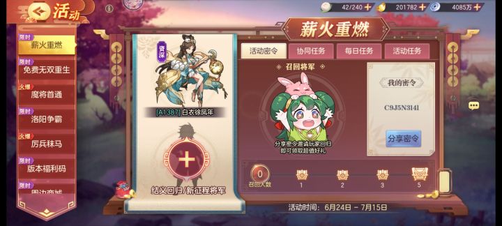 来个新手兄弟结义呀。113850001001006 这个是我的ID。我每天都在,很活跃。 然后想要礼包的可以填我的密令。感谢!密令C9J5N3141😊😊😉