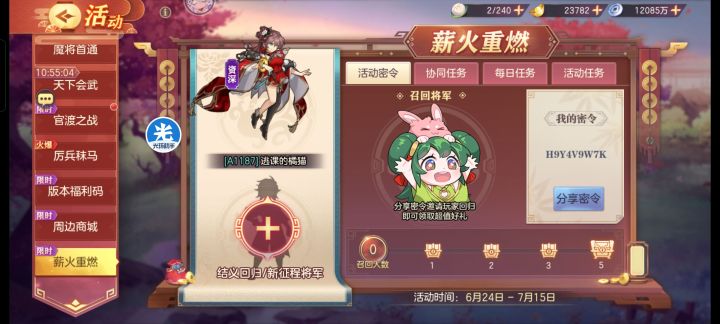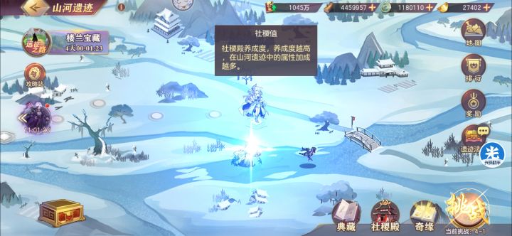 山河遗迹相当于一个主要玩法了,现版本山河已经大不如从前一样内卷,山河是在首区开42天的时候开启的,所以大家到时候可以用每天演武场结算显示的天数来推测还有多久开山河山河里面有一种数值叫社稷值,跟战力不挂钩的,但是跟武将星级,专武,灵宠挂钩,能搞蔡文姬加护佑就搞一下,不然推山河究极坐牢,属于必备!右下角那个奇缘也就是山河独立的一个卡池,抽这个可以让社稷值增长,也就是我第二张截图,但不是氪佬我不建议