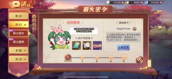 密令 P8g8N7U6G【三国志幻想大陆】春节版本望舒蔡文姬耀世登场,复制密令【P8g8N7U6G】,获取超值福利。