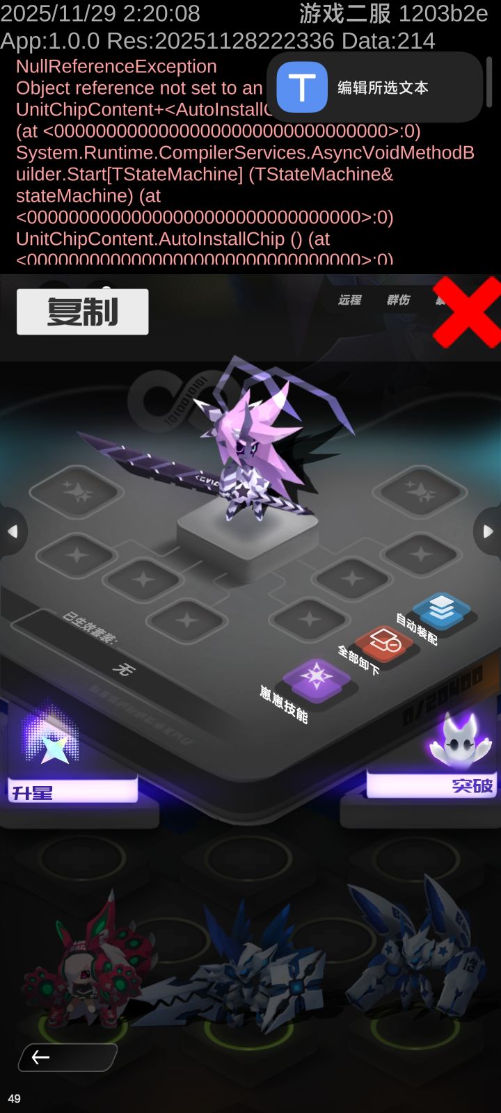 NullReferenceExceptionObject reference not set to an instance of an object.UnitChipContent+<AutoInstallChip>d__18.MoveNext () (at <00000000000000000000000000000000>:0)System.Runtime.CompilerService