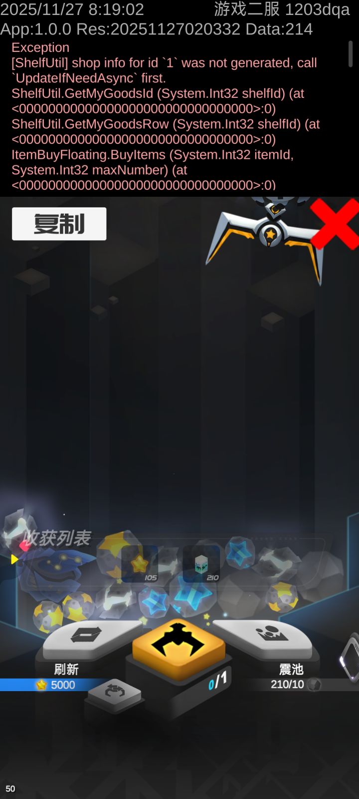 Exception[ShelfUtil] shop info for id `1` was not generated, call `UpdateIfNeedAsync` first.ShelfUtil.GetMyGoodsId (System.Int32 shelfId) (at <00000000000000000000000000000000>:0)ShelfUtil.GetMyGoo