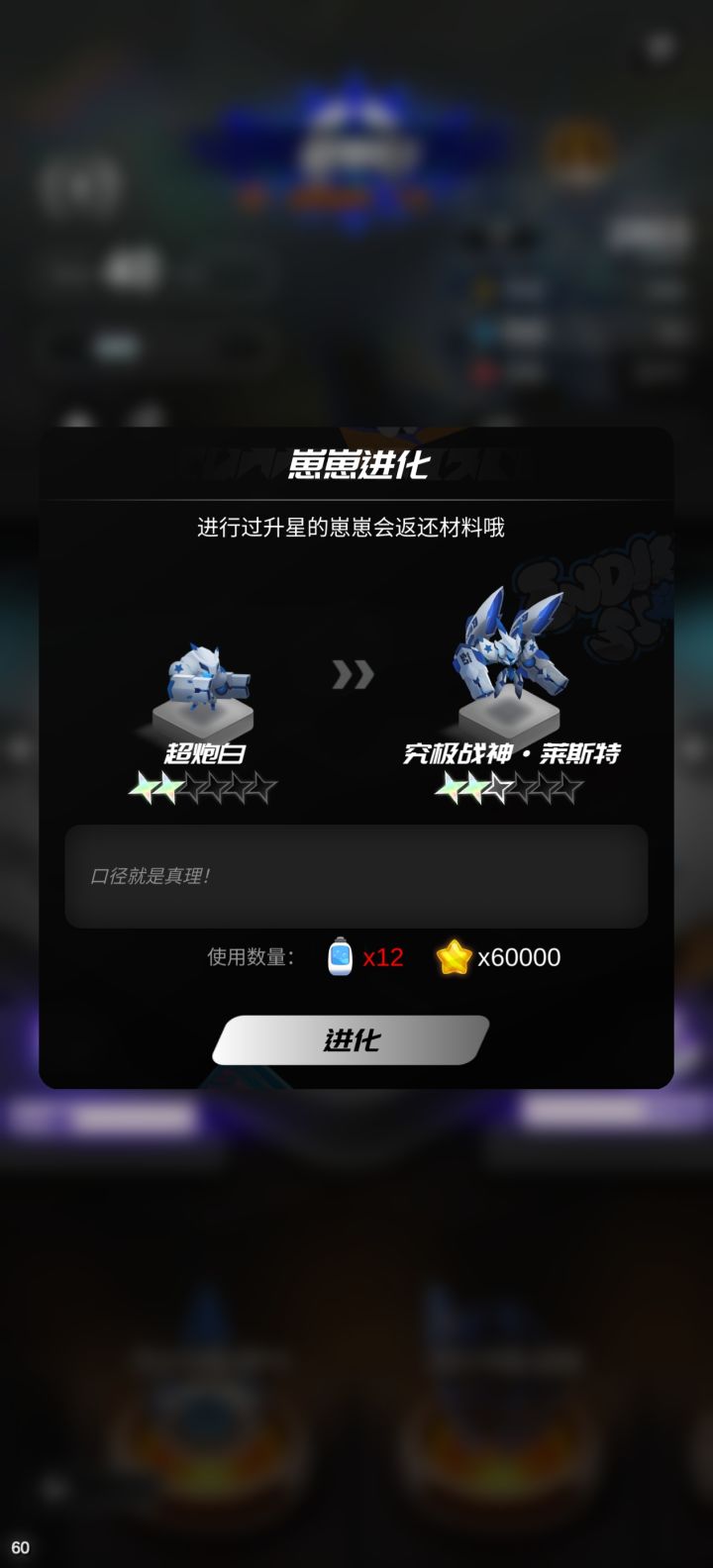 玩了两天,这游戏给我的感觉全是bug,你喵以前做过这类型的游戏啊,这次是什么鬼情况,限时任务今天又不能完成,给崽崽升星以后,进化也不返材料,还有星光体放技能,能把自己游戏一起时停,明明有刷新竞技场材料,提示我物品不足,我是眼睛聋吗,你游啥时候这么多bug了,我的评价是不如以前