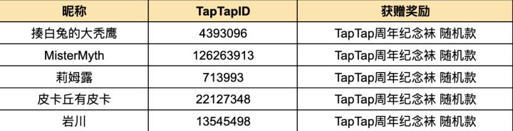 恭喜以下几位小伙伴获得奖励!感谢各位的参与,新的一年也希望大家能够继续支持我们!鞠躬!请获奖玩家直接点击 跳转进入个人资料编辑内,填写收货信息。或者在TapTap网页端进入【个人中心】进入【资料编辑】,填写相关收货信息如在1月11日18:00前未填写,则视为放弃奖励;如地址错误/电话错误导致快递小哥无法联系,则视为放弃奖励————————————————————各位好 这里是活动