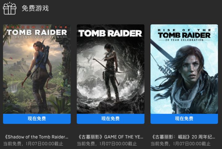 《》、《》、《》都可以直接领取入库了,领取时间截止到1月7日0点。我们也直接把本版块的名字“PC | Steam”改成了“PC | Steam | Epic”。《古墓丽影9 年度版》探索了劳拉·克劳馥紧张又勇敢的起源故事,以及她变为坚强生存者的成长过程。包含Tomb of the Lost Adventurer、6款劳拉的单人游戏服装以及4位角色。《古墓丽影:崛起 20周年纪念版》包括基础游戏