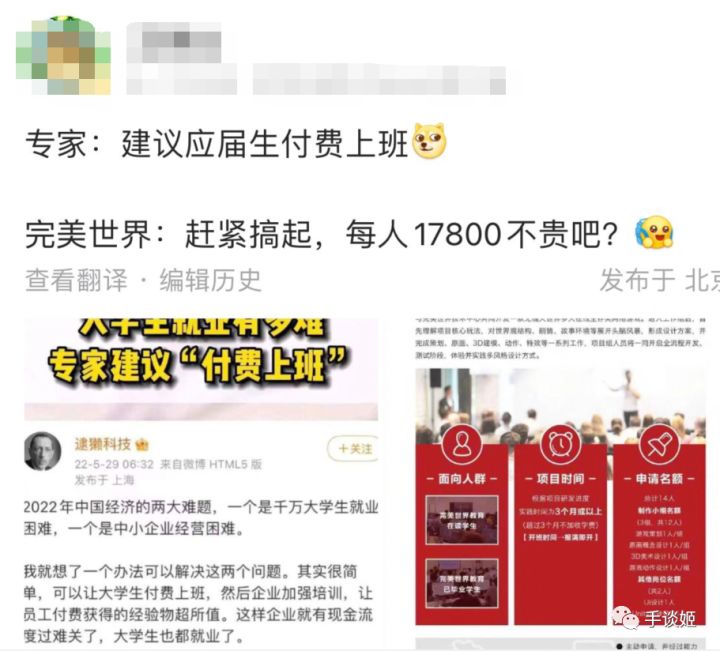 前段时间,由于“专家的建议”和民众的意愿产生了很大的偏差,于是乎在微博上出现了“建议专家不要建议”的热搜。恰好最近是高校毕业的时期,大学生就业难的问题又被搬到了台面,于是有博主就引述其他人的话说,专家建议付费上班。但其实稍微想想就知道,说“付费上班”的人显然是进行反讽,说这话也不一定是专家,不过似乎也不重要了。让人没想到的是,因为这个话题,游戏公司“完美世界”招人付费上班的图片,引起了一些媒