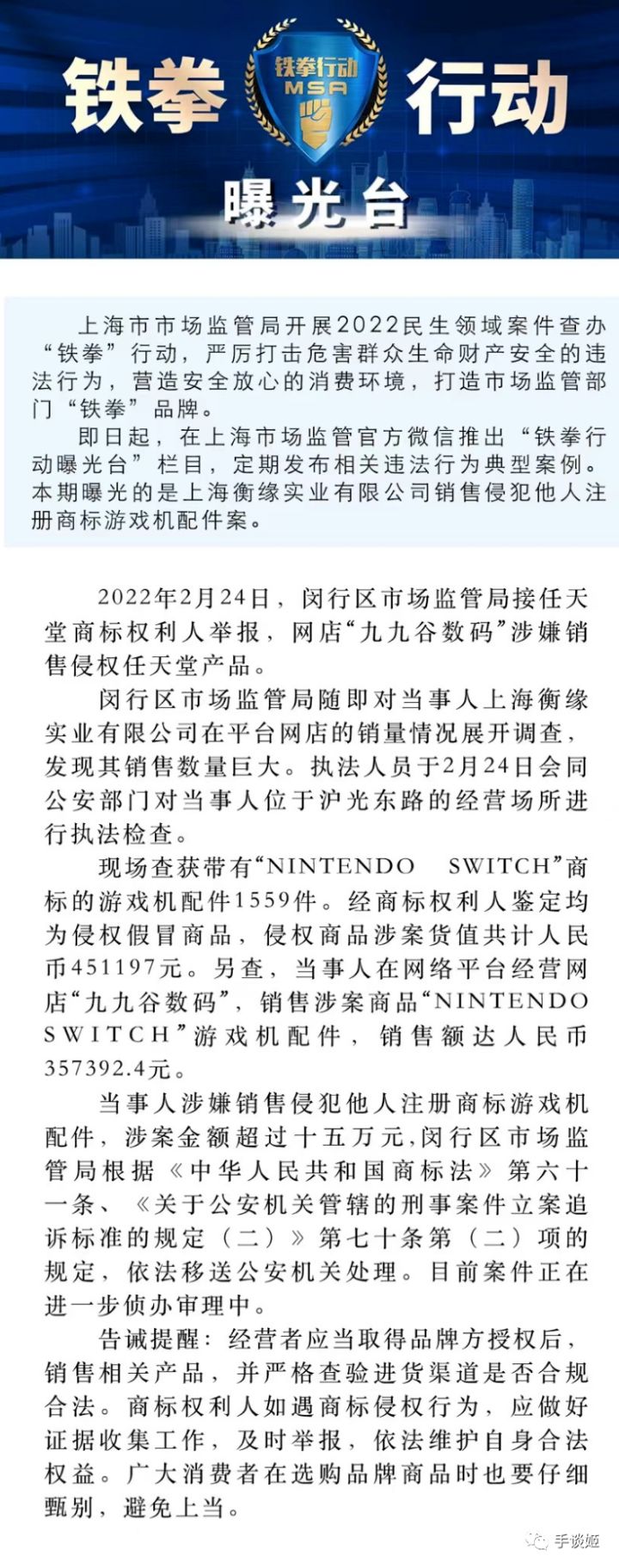 昨日,上海市市场监管官方曝光了一起因贩售假冒任天堂游戏机而被处罚的事件,查获带有“NINTENDOSWITCH”商标的游戏机配件1559件。经鉴定均为假冒,涉案货值共计人民币451197元。刚开始看的时候,手谈姬以为是非法走私的海外商品,但仔细一看居然是假冒的,而且数额还不少。据曝光说,当事人开着一家名叫“九九谷数码”的网店。姬想查找更多的信息,但淘宝上这家店的相关页面自然已经是不复存在了,