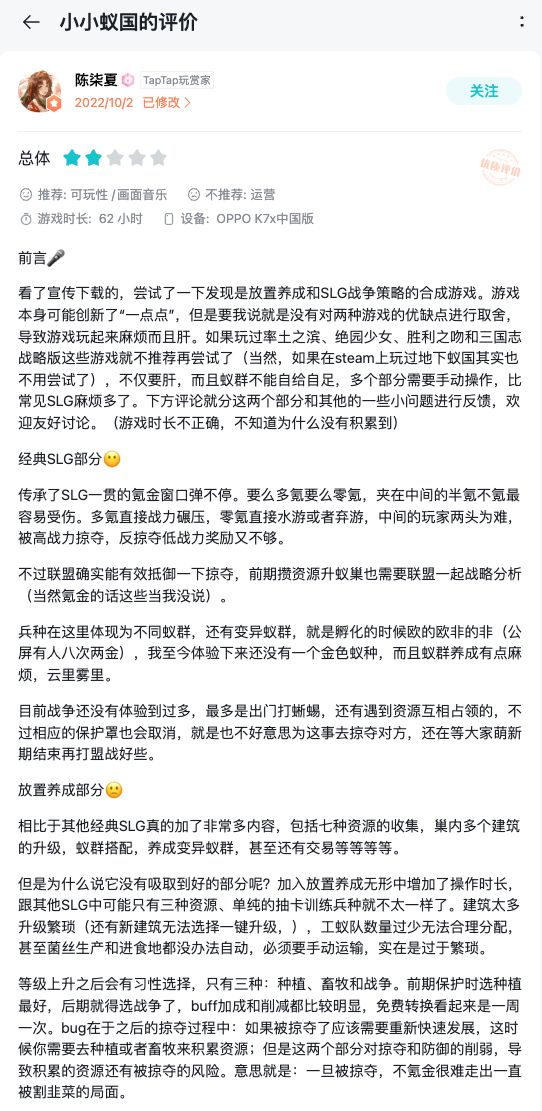 去年12月份,我们用优质评价功能重新激活了玩赏家系统,整个体系运行下来效果很不错,TapTap评价区的头部内容变得更加专业,并且也让许多原本沉默的玩家,开始进行评价的创作。背景信息: &我们在每月初都会发布上个月的「优质评价&玩赏家月报」,赋予好内容更多曝光,以及让优质的创作者有更大的影响力。下面进入正题:2022年3月份,TapTap全站入选优质评价74条,新增达标玩赏家12位。本月纯