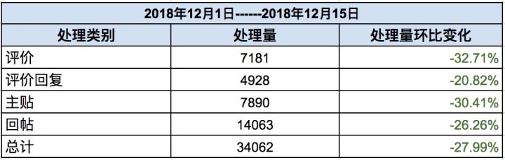 随着12月步入中旬,2018年也迎来了最后的两周,新的一年的大门也近在咫尺。跟着小管家一起来看看在2018年最后一个月的前两周社区发生了些什么吧~近两周社区举报统计 相比于十一月下半月,十二月前两周总举报量再次小幅减少,总举报量34459条,环比减少16.45%,实际处理量9187条,环比减少15.1%,举报成功率26.66%,维持在平均范围内。十二月上半月禁封账号总量为11824,同比上期