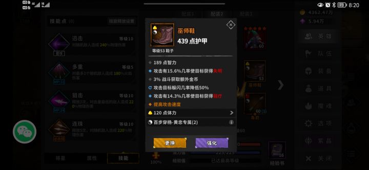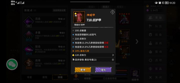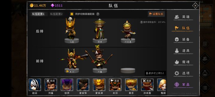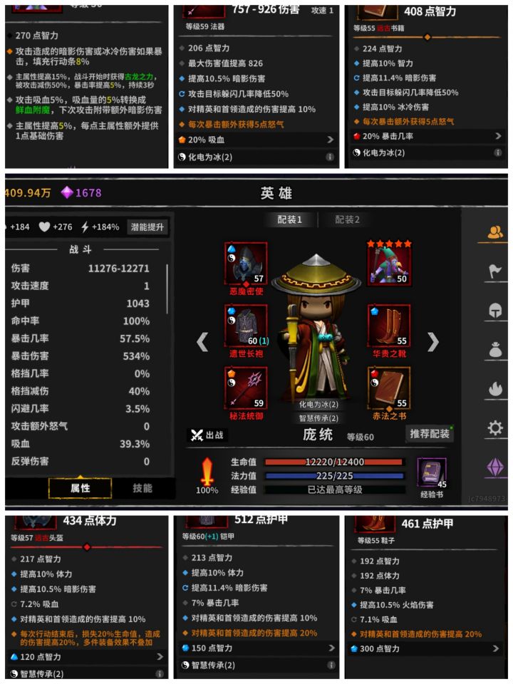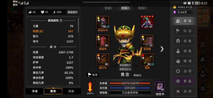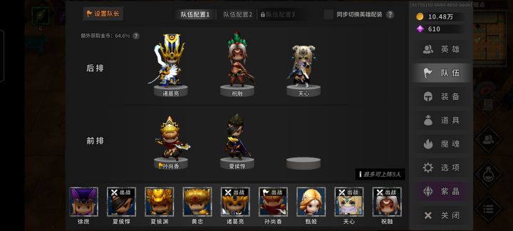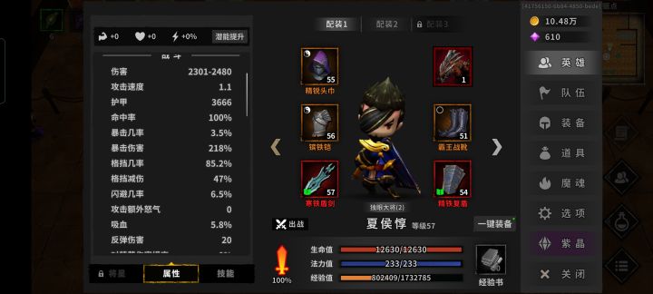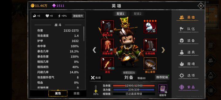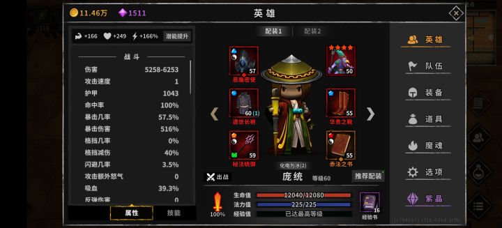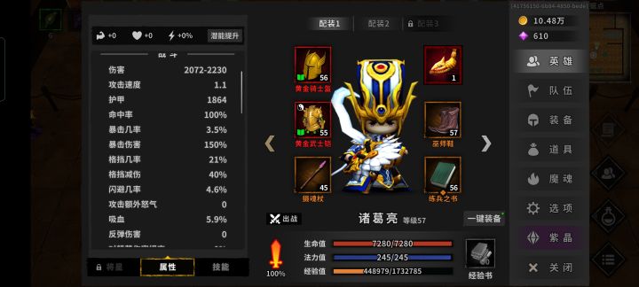 装备的话前期属性重要的是诸葛亮,一定要到就是暴击率配合夏侯渊,百分之九十九都不可以,差别真的很大,有时候就差这百分之一暴击这一层永夜重新打。