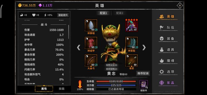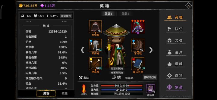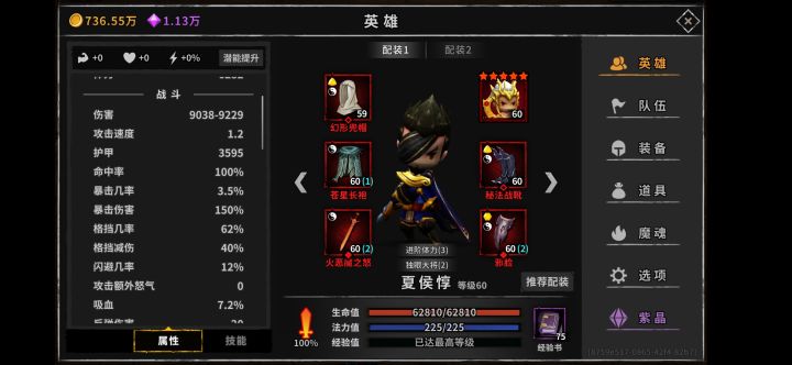 这游戏最大的乐趣就是可以选择流派,大佬的夏侯渊主C,我弄不来。也是想着图个乐子,打造了这个魔魂,目前暴击78.1。从开始到诸葛出手,夏侯渊共出手35次,武器普攻+1,技能25概率+1,普攻80次左右